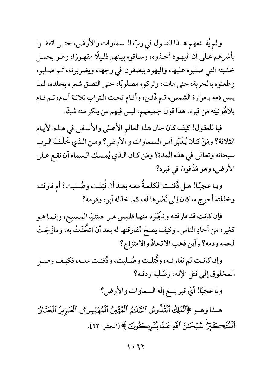 ولم يُقنعهم هذا القول في ربّ السماوات والأرض، حتى اتفقوا بأسْرهم على أن اليهود أخذوه، وساقوه بينهم ذليلًا مقهورًا، وهو يحمل خشبته التي صلبوه عليها، واليهود يبصقون في وجهه، ويضربونه، ثم صلبوه وطعنوه بالحربة، حتى مات، وتركوه مصلوبًا، حتى التصق شعره بجلده، لما يبس دمه بحرارة الشمس، ثم دُفن، وأقام تحت التراب ثلاثة أيام، ثم قام بلاهُوتيّتِه من قبره. هذا قول جميعهم، ليس فيهم من ينكر منه شيئًا.