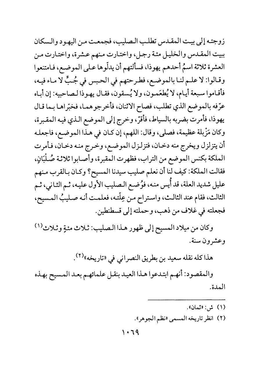 زوجته إلى بيت المقدس تطلب الصليب، فجمعت من اليهود والسكان ببيت المقدس والخليل مئة رجل، واختارت منهم عشرة، واختارت من العشرة ثلاثة اسمُ أحدهم يهوذا، فسألتهم أن يدلّوها على الموضع، فامتنعوا وقالوا: لا علم لنا بالموضع، فطرحتهم في الحبس في جُبٍّ لا ماء فيه، فأقاموا سبعة أيام، لا يُطعَمون، ولا يُسقون، فقال يهوذا لصاحبيه: إن أباه عرّفه بالموضع الذي تطلب، فصاح الاثنان، فأخرجوهما، فخبّراها بما قال يهوذا، فأمرت بضربه بالسياط، فأقرّ، وخرج إلى الموضع الذي فيه المقبرة، وكان مَزْبلة عظيمة، فصلى، وقال: اللهم، إن كان في هذا الموضع، فاجعله أن يتزلزل ويخرج منه دخان، فتزلزل الموضع، وخرج منه دخان، فأمرت الملكة بكنس الموضع من التراب، فظهرت المقبرة، وأصابوا ثلاثة صُلْبَانٍ، فقالت الملكة: كيف لنا أن نعلم صليب سيدنا المسيح؟ وكان بالقرب منهم عليل شديد العلة، قد أُيس منه، فوُضع الصليب الأول عليه، ثم الثاني، ثم الثالث، فقام عند الثالث، واستراح من عِلّته، فعلمت أنه صليبُ المسيح، فجعلته في غلاف من ذهب، وحملته إلى قسطنطين.