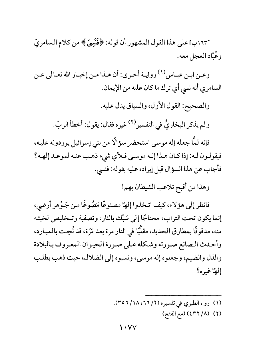 [١٦٣ ب] على هذا القول المشهور أن قوله: {فَنَسِيَ} من كلام السامريّ وعُبّاد العجل معه.