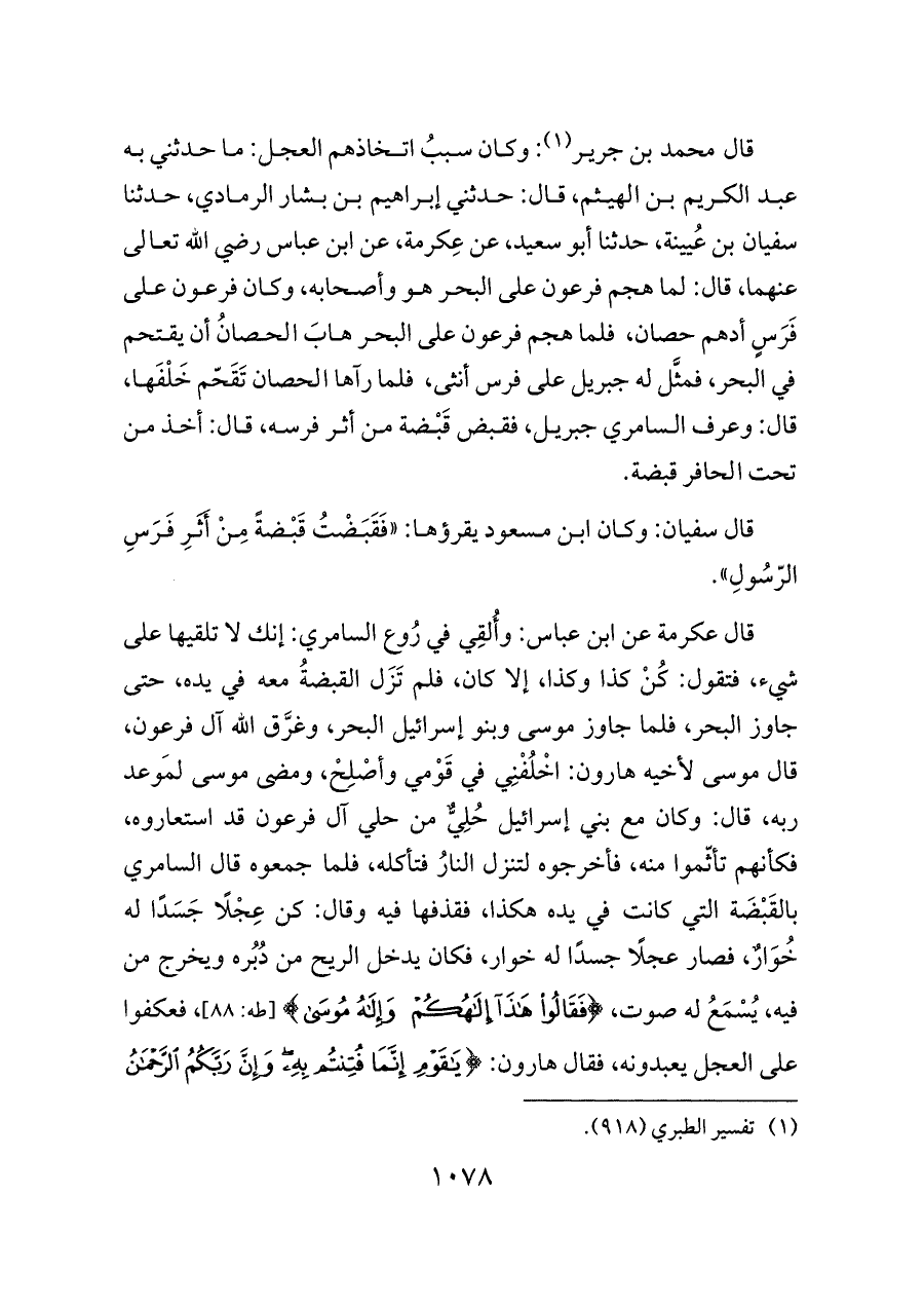 قال محمد بن جرير (¬١): وكان سببُ اتخاذهم العجل: ما حدثني به عبد الكريم بن الهيثم، قال: حدثني إبراهيم بن بشار الرمادي، حدثنا سفيان بن عُيينة، حدثنا أبو سعيد، عن عِكرمة، عن ابن عباس رضي الله تعالى عنهما، قال: لما هجم فرعون على البحر هو وأصحابه، وكان فرعون على فَرَسٍ أدهم حصان، فلما هجم فرعون على البحر هابَ الحصانُ أن يقتحم في البحر، فمثَّل له جبريل على فرس أنثى، فلما رآها الحصان تَقَحّم خَلْفَها، قال: وعرف السامري جبريل، فقبض قَبْضة من أثر فرسه، قال: أخذ من تحت الحافر قبضة.