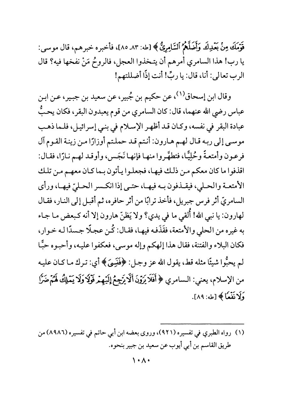 وقال ابن إسحاق (¬١)، عن حكيم بن جُبير، عن سعيد بن جبير، عن ابن عباس رضي الله عنهما، قال: كان السامري من قوم يعبدون البقر، فكان يحبُّ عبادة البقر في نفسه، وكان قد أظهر الإسلام في بني إسرائيل، فلما ذهب موسى إلى ربه قال لهم هارون: أنتم قد حملتم أوزارًا من زينة القوم آل فرعون وأمتعةً وحُلِيًّا، فتطهَّروا منها فإنها نَجَس، وأوقد لهم نارًا، فقال: اقذفوا ما كان معكم من ذلك فيها، فجعلوا يأتون بما كان معهم من تلك الأمتعة والحلي، فيقذفون به فيها، حتى إذا انكسر الحليّ فيها، ورأى السامريّ أثر فرس جبريل، فأخذ ترابًا من أثر حافره، ثم أقبل إلى النار، فقال لهارون: يا نبي الله! أُلقي ما في يدي؟ ولا يَظنّ هارون إلا أنه كبعض ما جاء به غيره من الحلي والأمتعة، فقَذَفه فيها، فقال: كُن عجلًا جسدًا له خوار، فكان البلاء والفتنة، فقال هذا إلهكم وإله موسى، فعكفوا عليه، وأحبوه حبًّا لم يحبُّوا شيئًا مثله قط، يقول الله عز وجل: {فَنَسِيَ} أي: ترك ما كان عليه من الإسلام، يعني: السامري {أَفَلَا يَرَوْنَ أَلَّا يَرْجِعُ إِلَيْهِمْ قَوْلًا وَلَا يَمْلِكُ لَهُمْ ضَرًّا وَلَا نَفْعًا} [طه: ٨٩].