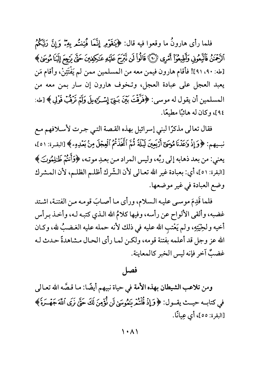 فلما رأى هارونُ ما وقعوا فيه قال: {يَاقَوْمِ إِنَّمَا فُتِنْتُمْ بِهِ وَإِنَّ رَبَّكُمُ الرَّحْمَنُ فَاتَّبِعُونِي وَأَطِيعُوا أَمْرِي (٩٠) قَالُوا لَنْ نَبْرَحَ عَلَيْهِ عَاكِفِينَ حَتَّى يَرْجِعَ إِلَيْنَا مُوسَى} [طه: ٩٠، ٩١]! فأقام هارون فيمن معه من المسلمين ممن لم يَفْتَتِنْ، وأقام مَن يعبد العجل على عبادة العجل، وتخوف هارون إن سار بمن معه من المسلمين أن يقول له موسى: {فَرَّقْتَ بَيْنَ بَنِي إِسْرَائِيلَ وَلَمْ تَرْقُبْ قَوْلِي} [طه: ٩٤]، وكان له هائبًا مطيعًا.