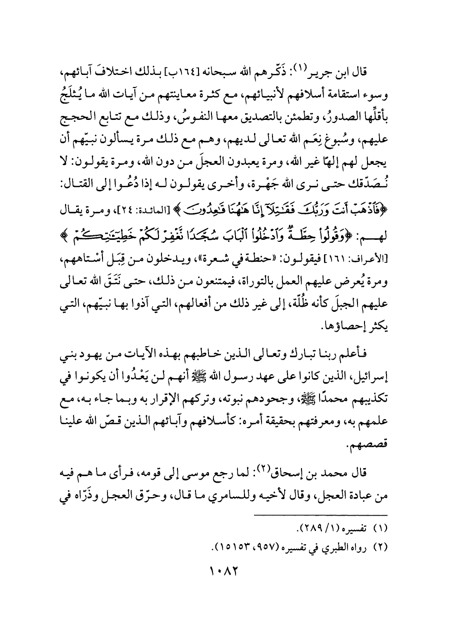 قال ابن جرير (¬١): ذَكّرهم الله سبحانه [١٦٤ ب] بذلك اختلافَ آبائهم، وسوء استقامة أسلافهم لأنبيائهم، مع كثرة معاينتهم من آيات الله ما يُثلَجُ بأقلِّها الصدورُ، وتطمئن بالتصديق معها النفوسُ، وذلك مع تتابع الحجج عليهم، وسُبوغ نِعَم الله تعالى لديهم، وهم مع ذلك مرة يسألون نبيّهم أن يجعل لهم إلهًا غير الله، ومرة يعبدون العجلَ من دون الله، ومرة يقولون: لا نُصَدّقك حتى نرى الله جَهْرة، وأخرى يقولون له إذا دُعُوا إلى القتال: {فَاذْهَبْ أَنْتَ وَرَبُّكَ فَقَاتِلَا إِنَّا هَاهُنَا قَاعِدُونَ} [المائدة: ٢٤]، ومرة يقال لهم: {وَقُولُوا حِطَّةٌ وَادْخُلُوا الْبَابَ سُجَّدًا نَغْفِرْ لَكُمْ خَطِيئَاتِكُمْ} [الأعراف: ١٦١] فيقولون: «حنطةفي شعرة»، ويدخلون من قِبَل أسْتاههم، ومرة يُعرض عليهم العمل بالتوراة، فيمتنعون من ذلك، حتى نَتَقَ الله تعالى عليهم الجبلَ كأنه ظُلّة، إلى غير ذلك من أفعالهم، التي آذوا بها نبيّهم، التي يكثر إحصاؤها.