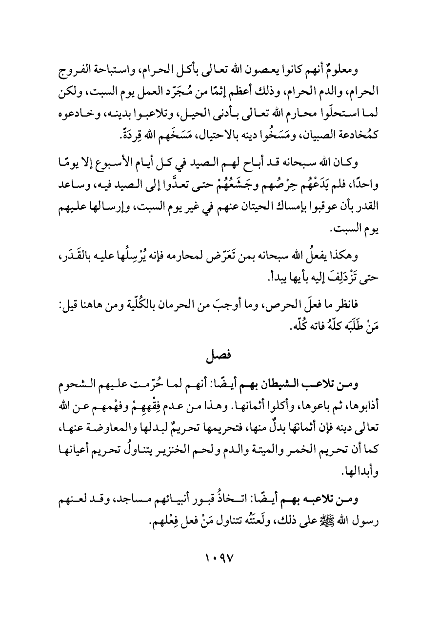 ومعلومٌ أنهم كانوا يعصون الله تعالى بأكل الحرام، واستباحة الفروج الحرام، والدم الحرام، وذلك أعظم إثمًا من مُجَرّد العمل يوم السبت، ولكن لما استحلّوا محارم الله تعالى بأدنى الحيل، وتلاعبوا بدينه، وخادعوه كمُخادعة الصبيان، ومَسَخُوا دينه بالاحتيال، مَسَخَهم الله قِردَةً.