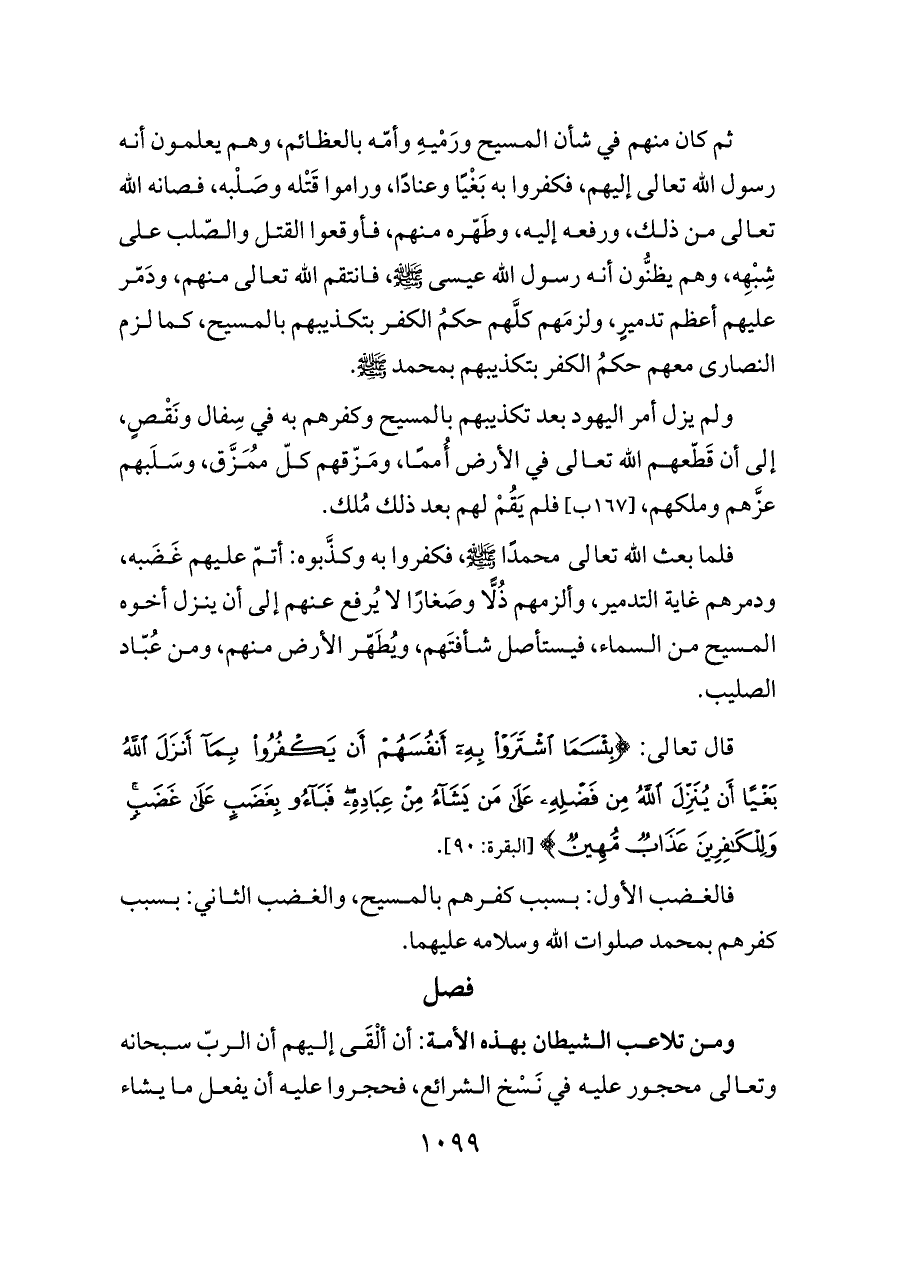 فلما بعث الله تعالى محمدًا - صلى الله عليه وسلم -، فكفروا به وكذَّبوه: أتمّ عليهم غَضَبه، ودمرهم غاية التدمير، وألزمهم ذُلًّا وصَغارًا لا يُرفع عنهم إلى أن ينزل أخوه المسيح من السماء، فيستأصل شأفتَهم، ويُطَهّر الأرض منهم، ومن عُبّاد الصليب.