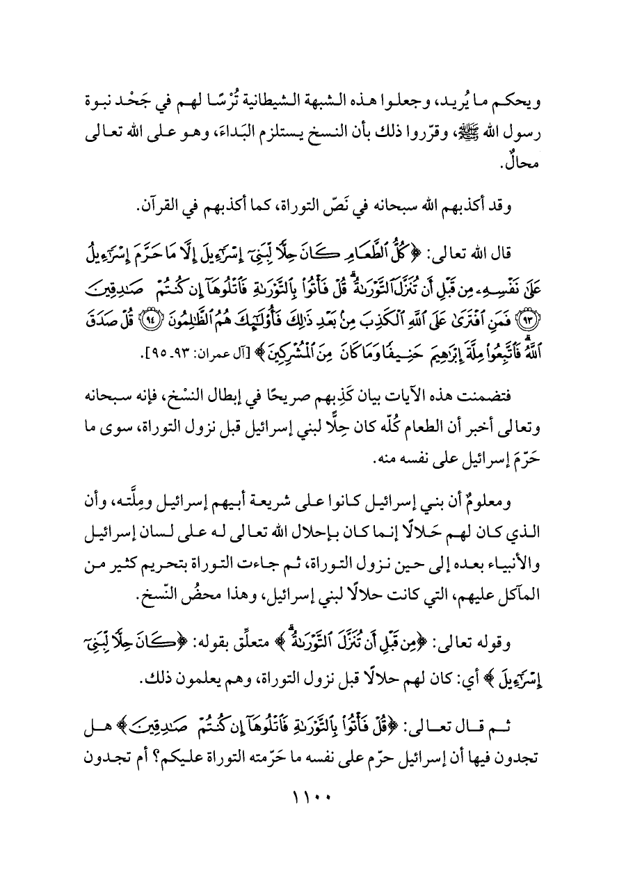 فتضمنت هذه الآيات بيان كَذِبهم صريحًا في إبطال النسْخ، فإنه سبحانه وتعالى أخبر أن الطعام كُلّه كان حِلًّا لبني إسرائيل قبل نزول التوراة، سوى ما حَرّمَ إسرائيل على نفسه منه.