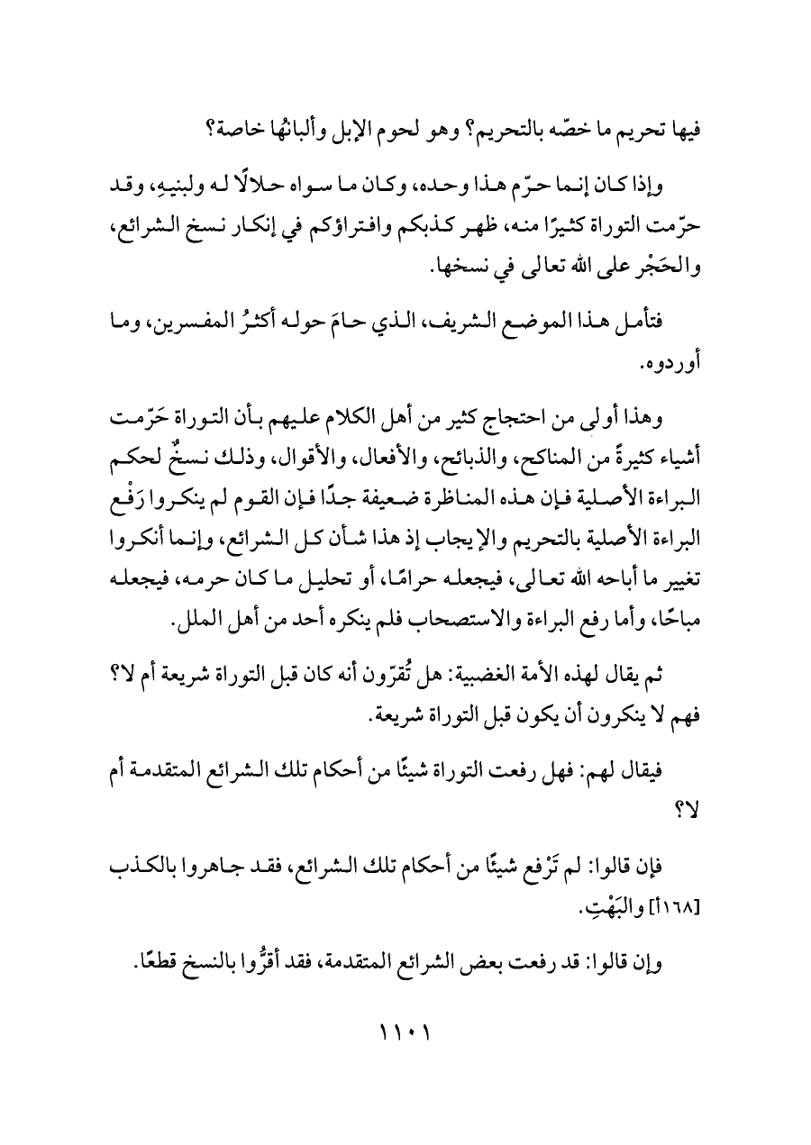 وهذا أولى من احتجاج كثير من أهل الكلام عليهم بأن التوراة حَرّمت أشياء كثيرةً من المناكح، والذبائح، والأفعال، والأقوال، وذلك نسخٌ لحكم البراءة الأصلية فإن هذه المناظرة ضعيفة جدًا فإن القوم لم ينكروا رَفْع البراءة الأصلية بالتحريم والإيجاب إذ هذا شأن كل الشرائع، وإنما أنكروا تغيير ما أباحه الله تعالى، فيجعله حرامًا، أو تحليل ما كان حرمه، فيجعله مباحًا، وأما رفع البراءة والاستصحاب فلم ينكره أحد من أهل الملل.