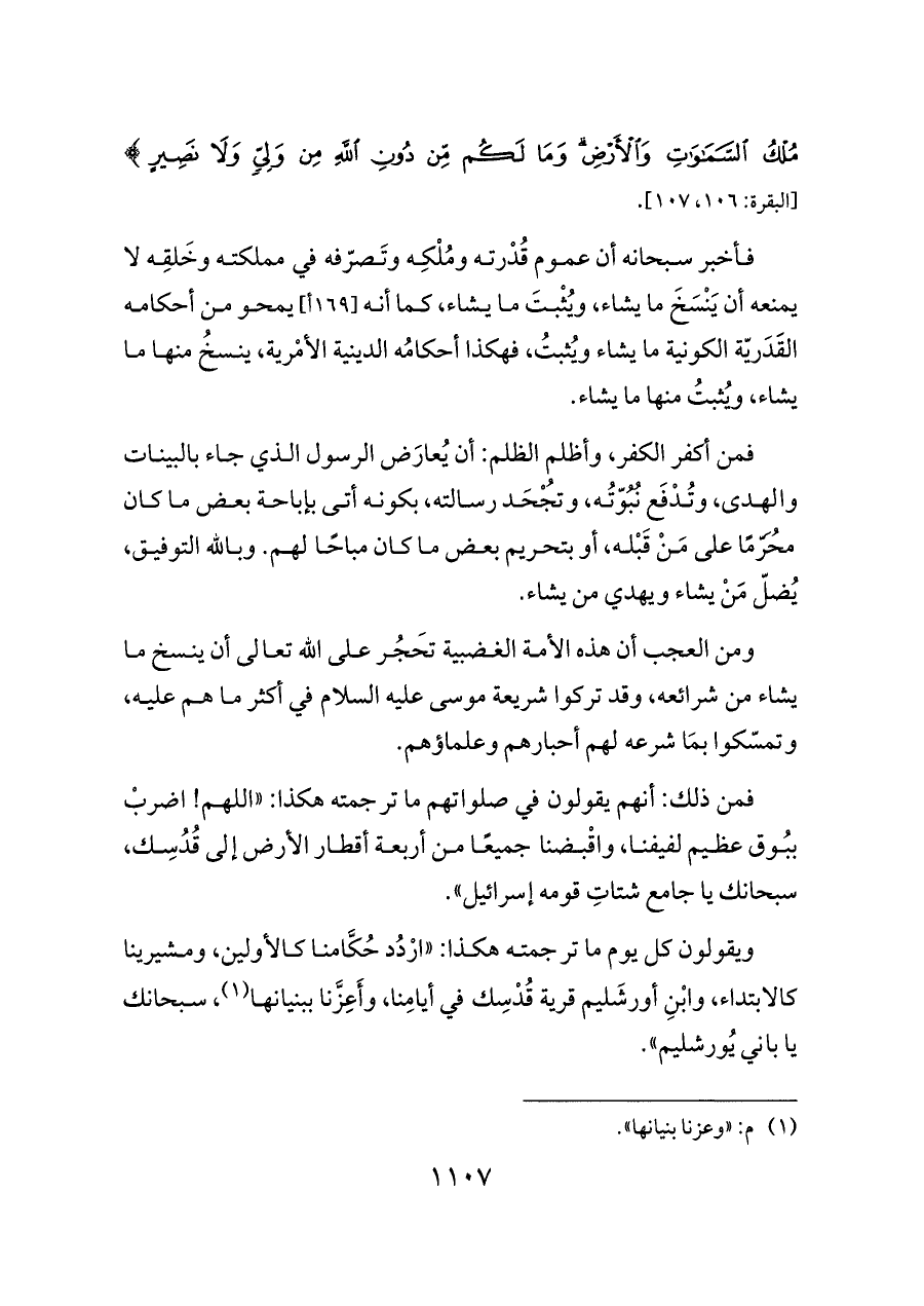 ومن العجب أن هذه الأمة الغضبية تَحجُر على الله تعالى أن ينسخ ما يشاء من شرائعه، وقد تركوا شريعة موسى عليه السلام في أكثر ما هم عليه، وتمسّكوا بمَا شرعه لهم أحبارهم وعلماؤهم.