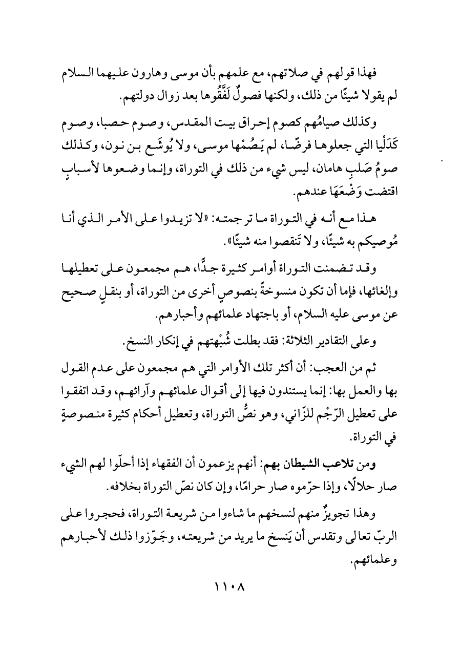 ثم من العجب: أن أكثر تلك الأوامر التي هم مجمعون على عدم القول بها والعمل بها: إنما يستندون فيها إلى أقوال علمائهم وآرائهم، وقد اتفقوا على تعطيل الرّجْم للزّاني، وهو نصُّ التوراة، وتعطيل أحكام كثيرة منصوصةٍ في التوراة.