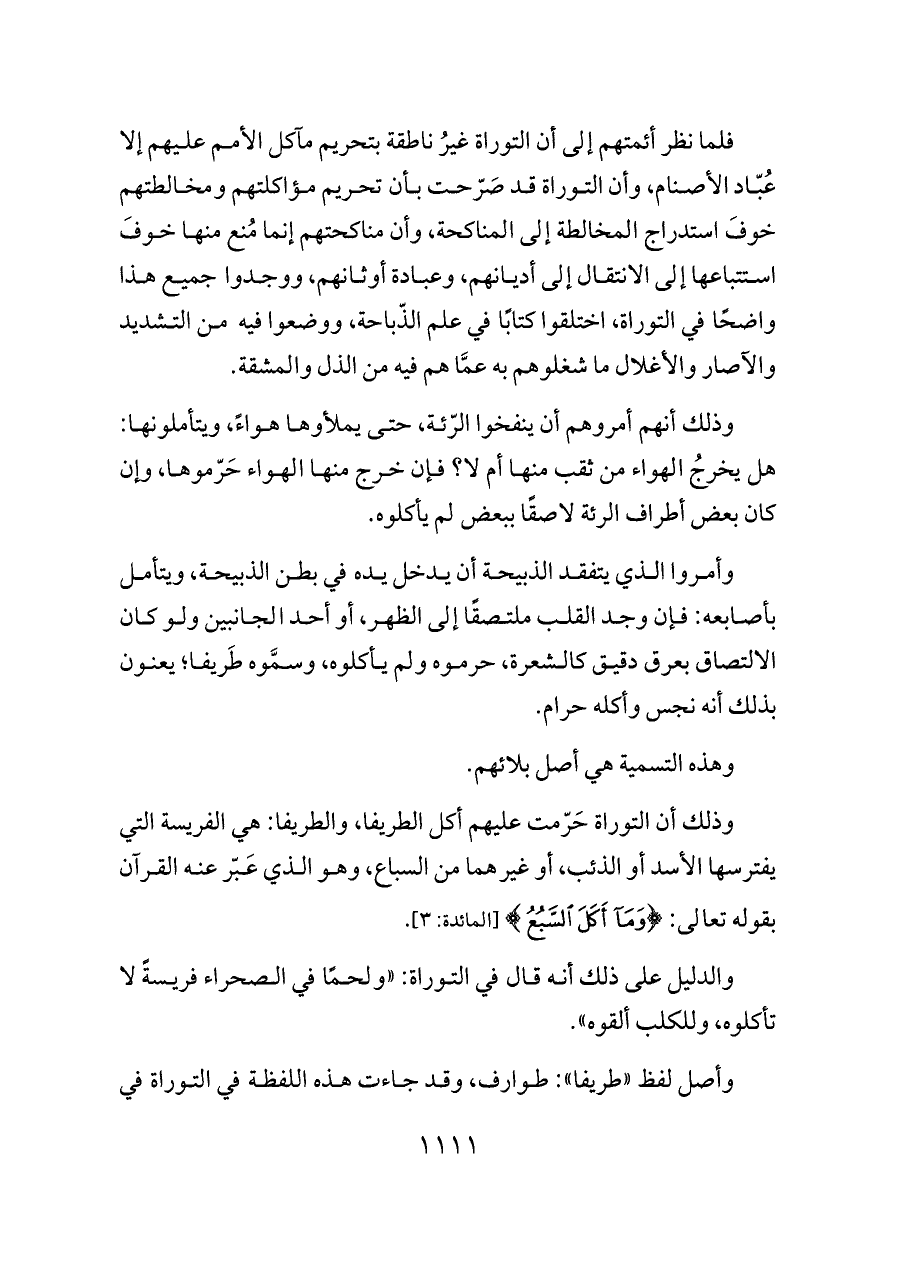 فلما نظر أئمتهم إلى أن التوراة غيرُ ناطقة بتحريم مآكل الأمم عليهم إلا عُبّاد الأصنام، وأن التوراة قد صَرّحت بأن تحريم مؤاكلتهم ومخالطتهم خوفَ استدراج المخالطة إلى المناكحة، وأن مناكحتهم إنما مُنع منها خوفَ استتباعها إلى الانتقال إلى أديانهم، وعبادة أوثانهم، ووجدوا جميع هذا واضحًا في التوراة، اختلقوا كتابًا في علم الذّباحة، ووضعوا فيه من التشديد والآصار والأغلال ما شغلوهم به عمَّا هم فيه من الذل والمشقة.