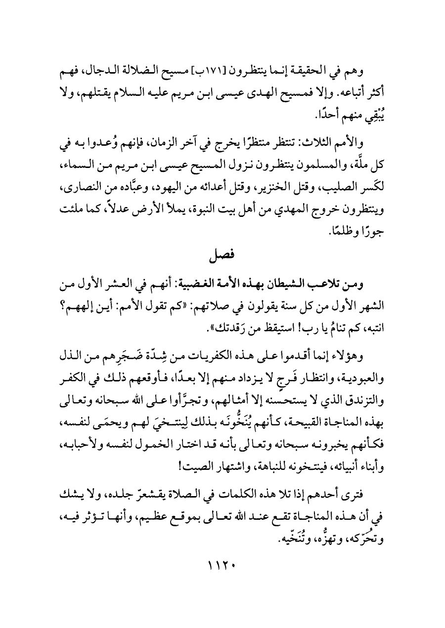 وهم في الحقيقة إنما ينتظرون [١٧١ ب] مسيح الضلالة الدجال، فهم أكثر أتباعه. وإلا فمسيح الهدى عيسى ابن مريم عليه السلام يقتلهم، ولا يُبْقِي منهم أحدًا.