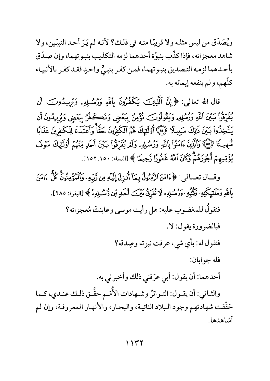 ويُصَدّق من ليس مثله ولا قريبًا منه في ذلك؟ لأنه لم يَرَ أحد النبيّين، ولا شاهد معجزاته، فإذا كذّب بنبوّة أحدهما لزمه التكذيب بنبوتهما، وإن صدّق بأحدهما لزمه التصديق بنبوتهما، فمن كفر بنبيٍّ واحدٍ فقد كفر بالأنبياء كلّهم، ولم ينفعه إيمانه به.