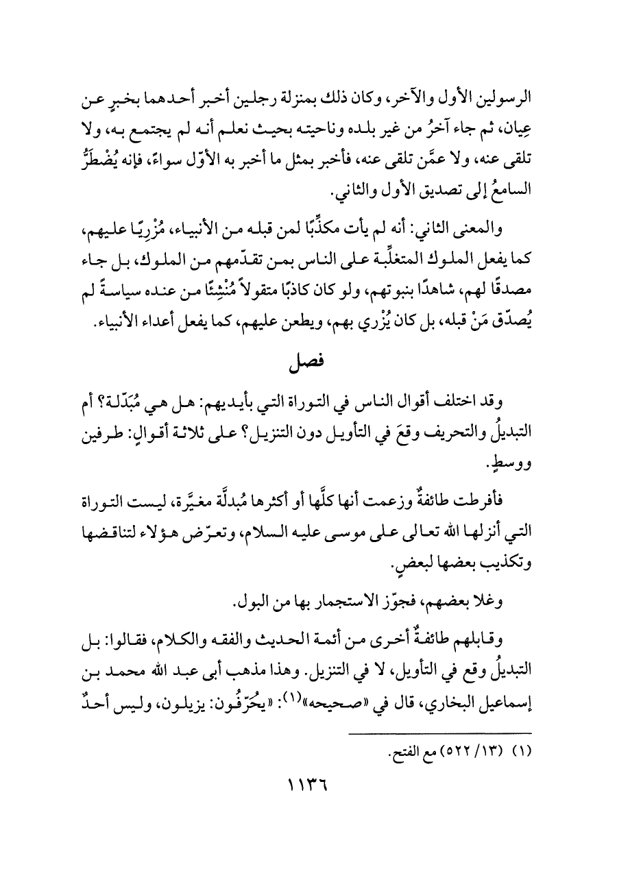 وقابلهم طائفةٌ أخرى من أئمة الحديث والفقه والكلام، فقالوا: بل التبديلُ وقع في التأويل، لا في التنزيل. وهذا مذهب أبى عبد الله محمد بن إسماعيل البخاري، قال في «صحيحه» (¬١): «يُحَرّفُون: يزيلون، وليس أحدٌ