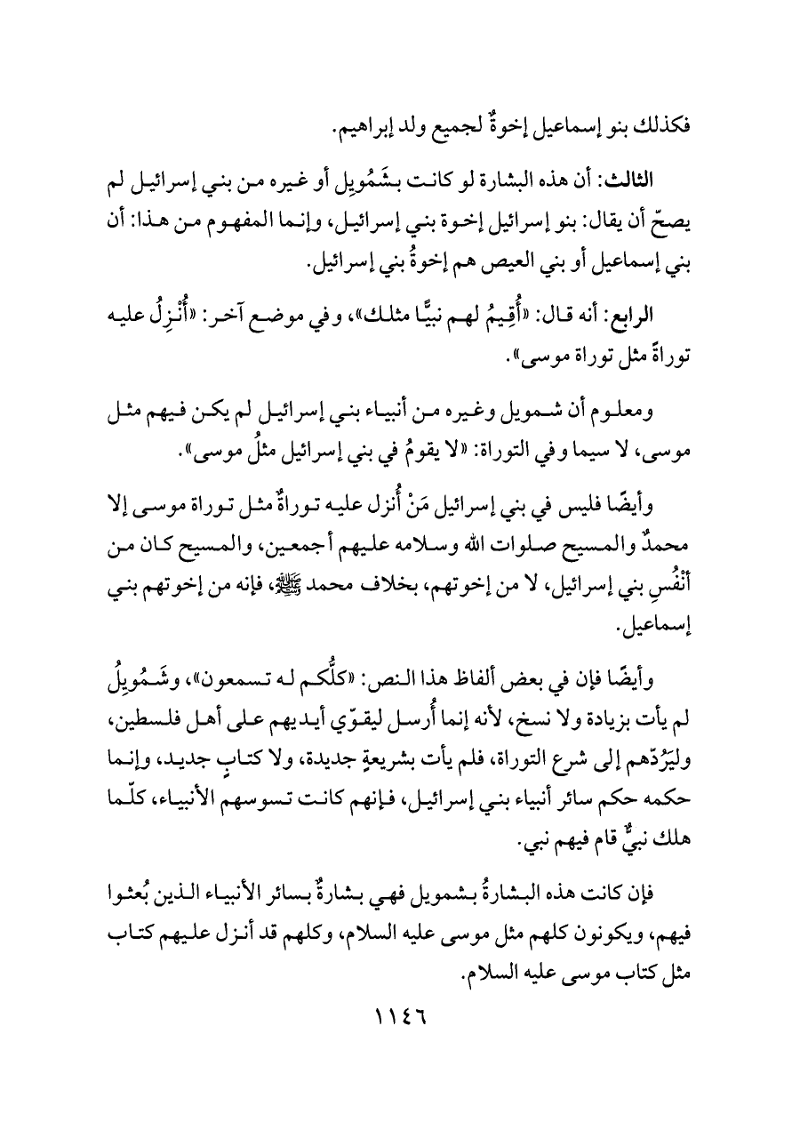 الثالث: أن هذه البشارة لو كانت بشَمُويِل أو غيره من بني إسرائيل لم يصحّ أن يقال: بنو إسرائيل إخوة بني إسرائيل، وإنما المفهوم من هذا: أن بني إسماعيل أو بني العيص هم إخوةُ بني إسرائيل.