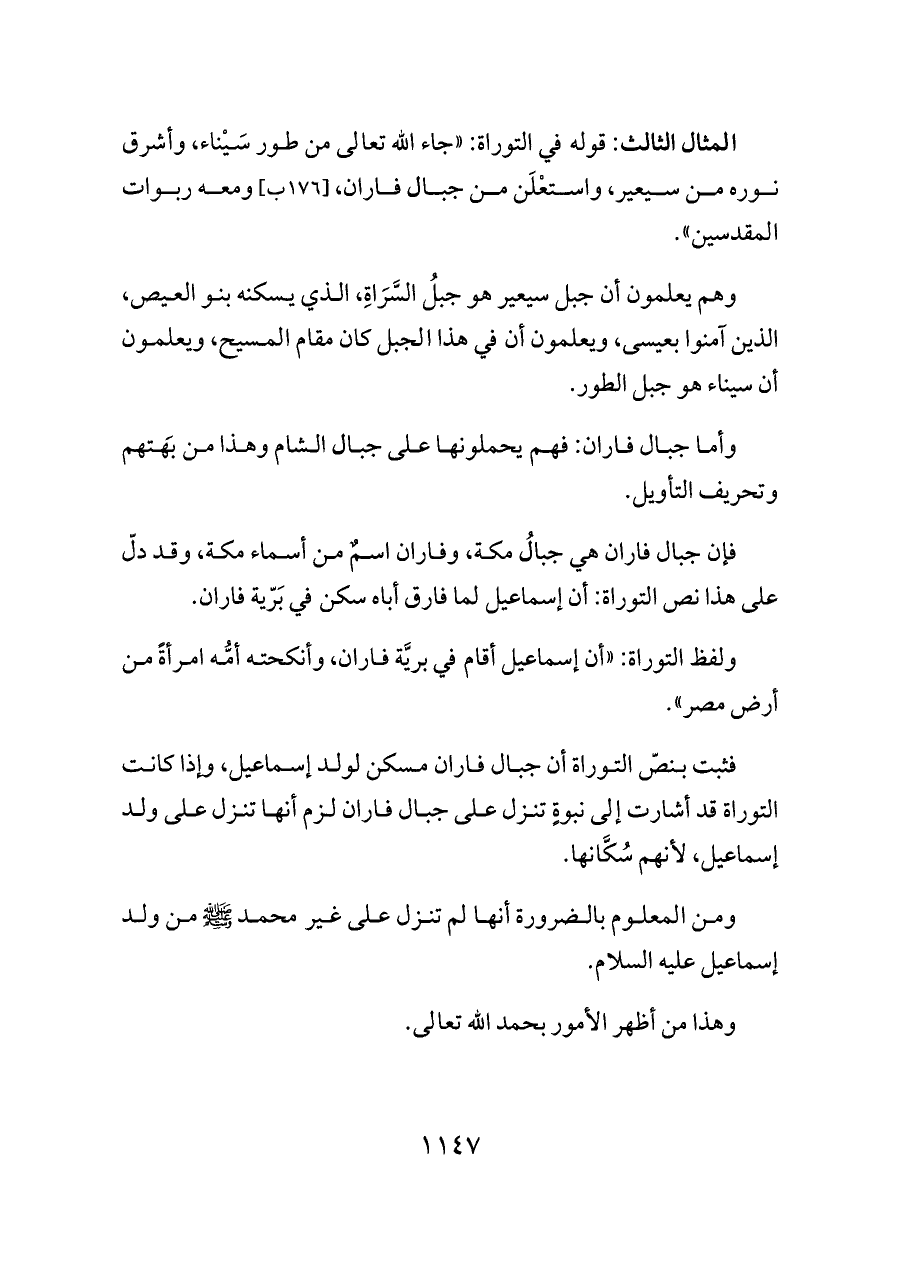 المثال الثالث: قوله في التوراة: «جاء الله تعالى من طور سَيْناء، وأشرق نوره من سيعير، واستعْلَن من جبال فاران، [١٧٦ ب] ومعه ربوات المقدسين».