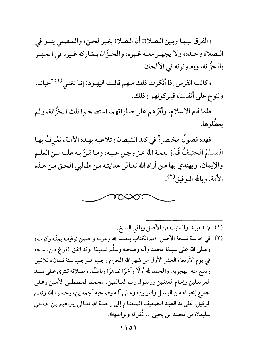 (¬٢) في خاتمة نسخة الأصل: «تم الكتاب بحمد الله وعونه وحسن توفيقه بمنّه وكرمه، وصلى الله على سيدنا محمد وآله وصحبه وسلَّم تسليمًا. وقد اتفق الفراغ من نسخه في يوم الأربعاء العشر الأول من شهر الله الحرام رجب المرجب سنة ثمان وثلاثين وسبع مئة الهجرية. والحمد لله أولًا وآخرًا ظاهرًا وباطنًا، وصلاته تترى على سيد المرسلين وإمام المتقين ورسول رب العالمين، محمد المصطفى الأمين وعلى جميع إخوانه من الرسل والنبيين، وعلى آله وصحبه أجمعين، وحسبنا الله ونعم الوكيل. على يد العبد الضعيف المحتاج إلى رحمة الله تعالى إبراهيم بن حاجي سليمان بن محمد بن يحيى ... غُفر له ولوالديه».