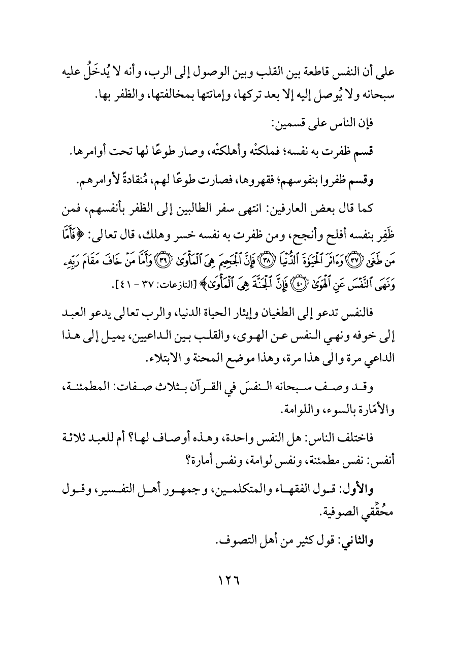 على أن النفس قاطعة بين القلب وبين الوصول إلى الرب، وأنه لا يُدخَلُ عليه سبحانه ولا يُوصل إليه إلا بعد تركها، وإماتتها بمخالفتها، والظفر بها.