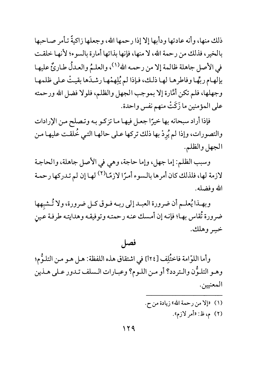 وأما اللوّامة فاختُلِف [٢٤ أ] في اشتقاق هذه اللفظة: هل هو من التلوُّم؛ وهو التلوُّن والتردد؟ أو من اللوم؟ وعبارات السلف تدور على هذين المعنيين.