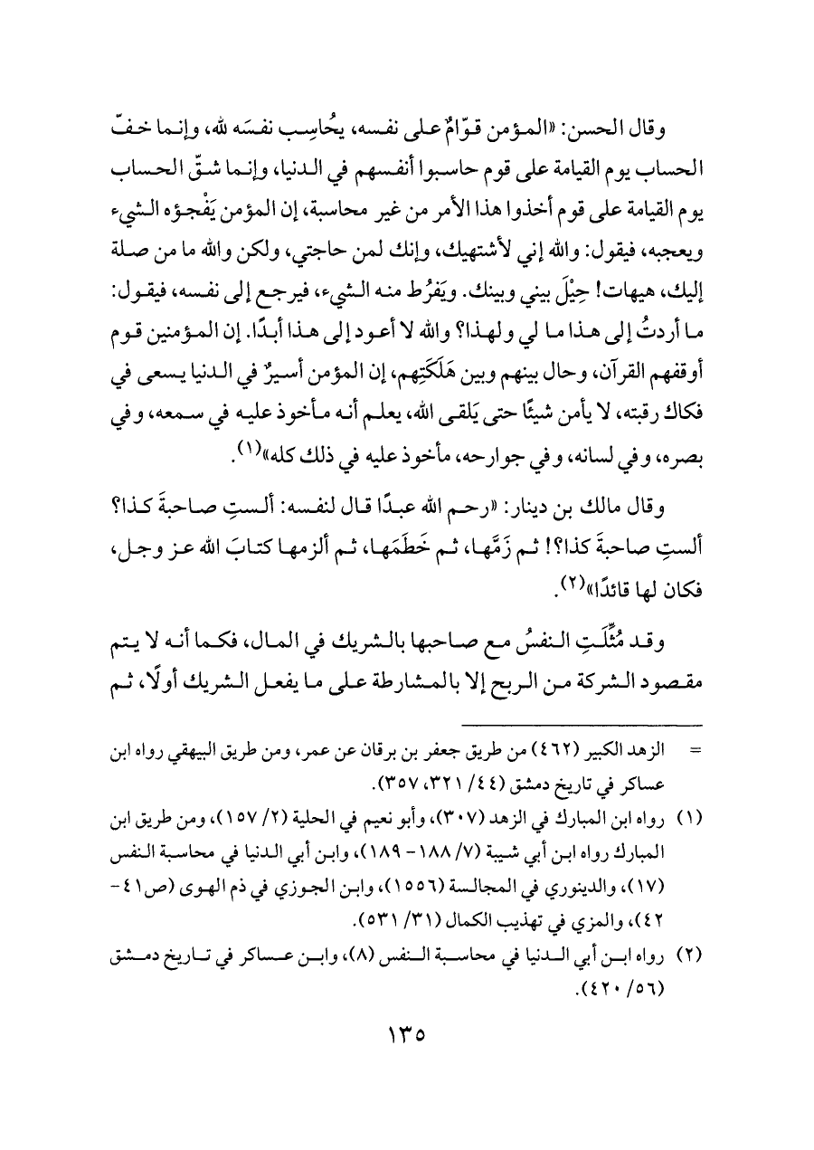 (¬١) رواه ابن المبارك في الزهد (٣٠٧)، وأبو نعيم في الحلية (٢/ ١٥٧)، ومن طريق ابن المبارك رواه ابن أبي شيبة (٧/ ١٨٨ - ١٨٩)، وابن أبي الدنيا في محاسبة النفس (١٧)، والدينوري في المجالسة (١٥٥٦)، وابن الجوزي في ذم الهوى (ص ٤١ - ٤٢)، والمزي في تهذيب الكمال (٣١/ ٥٣١).