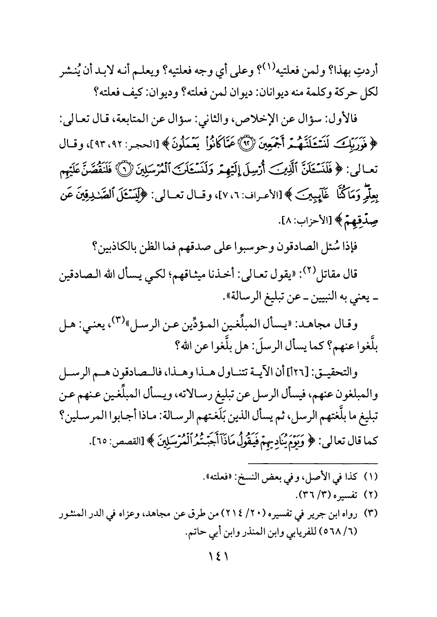 فالأول: سؤال عن الإخلاص، والثاني: سؤال عن المتابعة، قال تعالى: {فَوَرَبِّكَ لَنَسْأَلَنَّهُمْ أَجْمَعِينَ (٩٢) عَمَّا كَانُوا يَعْمَلُونَ} [الحجر: ٩٢، ٩٣]، وقال تعالى: {فَلَنَسْأَلَنَّ الَّذِينَ أُرْسِلَ إِلَيْهِمْ وَلَنَسْأَلَنَّ الْمُرْسَلِينَ (٦) فَلَنَقُصَّنَّ عَلَيْهِمْ بِعِلْمٍ وَمَا كُنَّا غَائِبِينَ} [الأعراف: ٦، ٧]، وقال تعالى: {لِيَسْأَلَ الصَّادِقِينَ عَنْ صِدْقِهِمْ} [الأحزاب: ٨].