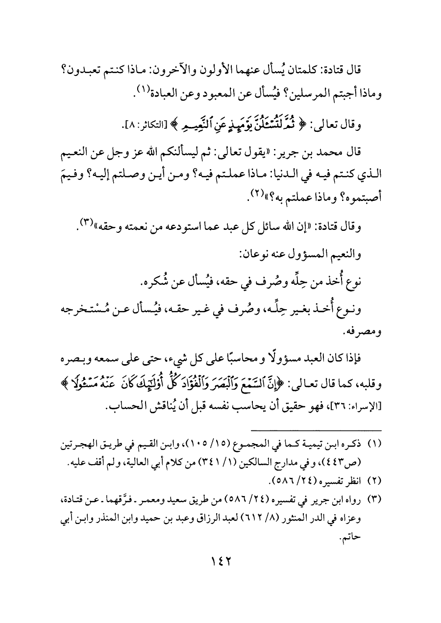 قال محمد بن جرير: «يقول تعالى: ثم ليسألنكم الله عز وجل عن النعيم الذي كنتم فيه في الدنيا: ماذا عملتم فيه؟ ومن أين وصلتم إليه؟ وفيمَ أصبتموه؟ وماذا عملتم به؟» (¬٢).