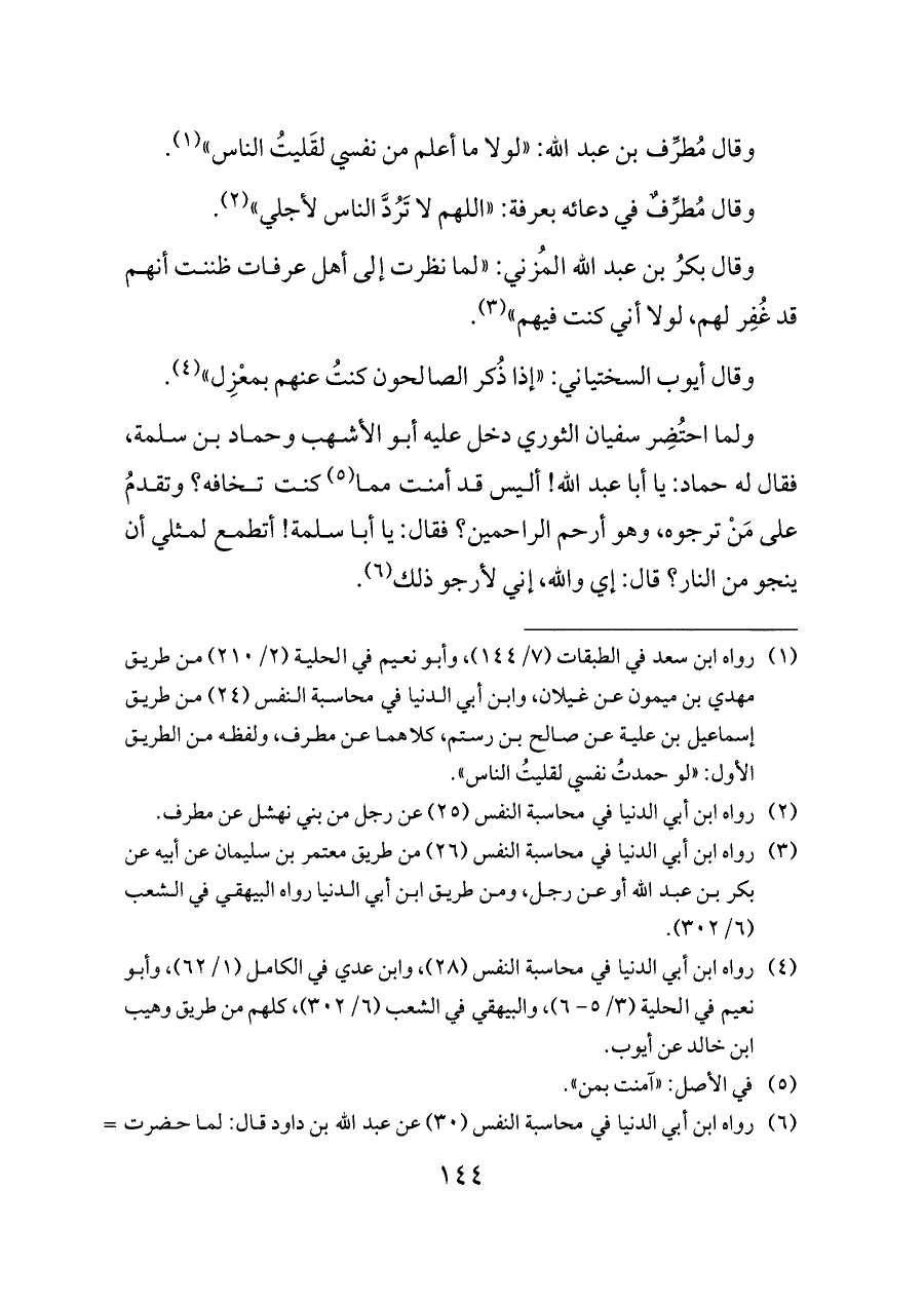 (¬٦) رواه ابن أبي الدنيا في محاسبة النفس (٣٠) عن عبد الله بن داود قال: لما حضرت سفيان الثوري الوفاة قال لرجل: أدخل عليّ رجلين .. وذكره ابن الجوزي في صفة الصفوة (٣/ ١٥١) عن ابن أبجر قال: لما حضرت سفيان الوفاة قال: يا ابن أبجر، قد نزل بي ما ترى فانظر من يحضرني ... وذكر القصة.