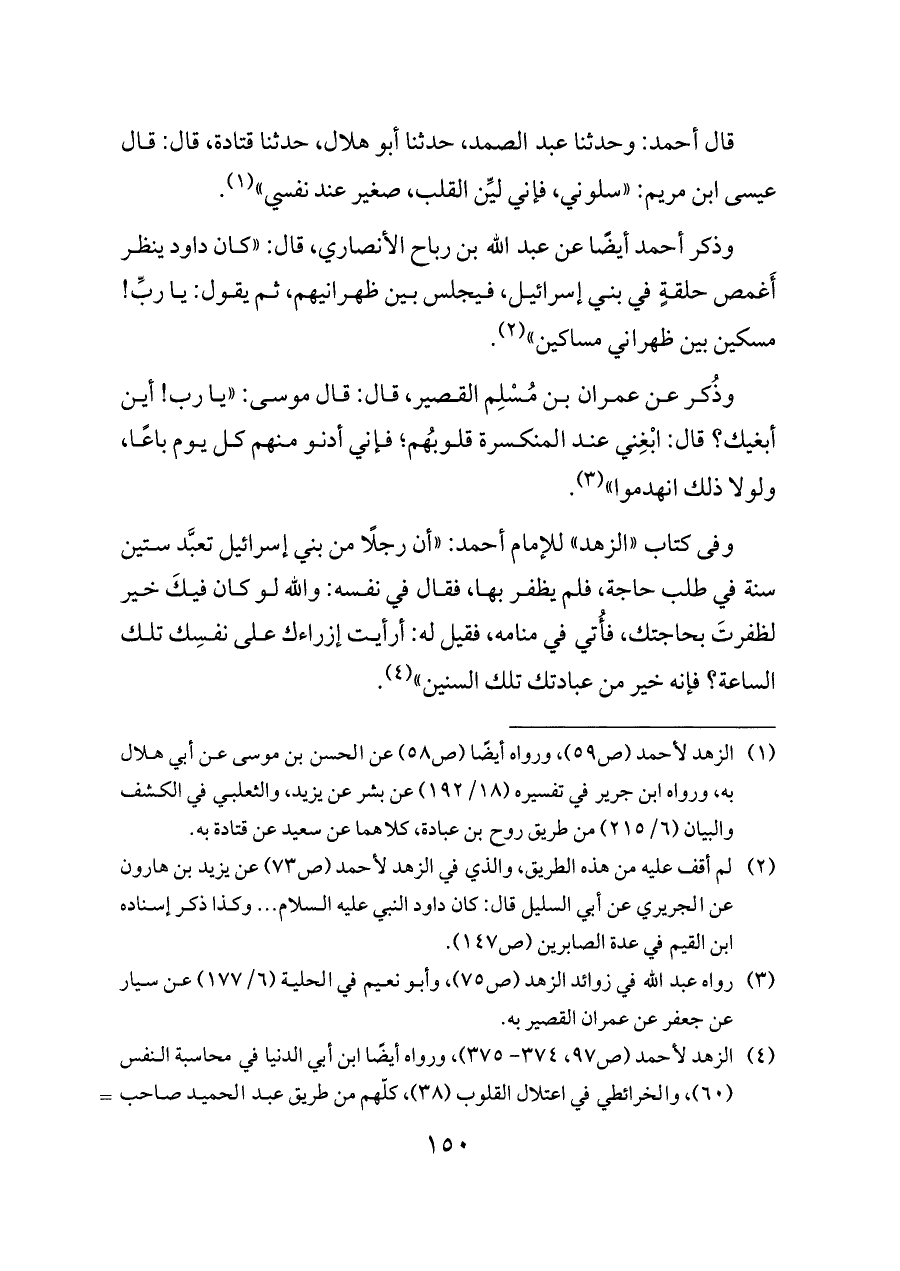 (¬٤) الزهد لأحمد (ص ٩٧، ٣٧٤ - ٣٧٥)، ورواه أيضًا ابن أبي الدنيا في محاسبة النفس (٦٠)، والخرائطي في اعتلال القلوب (٣٨)، كلّهم من طريق عبد الحميد صاحب الزيادي عن وهب بن منبه نحوه، ومن طريق ابن أبي الدنيا رواه ابن الجوزي في ذم الهوى (ص ٤٦)، ورواه البيهقي في الشعب (٥/ ٤٣٣) من طريق عبد الحميد صاحب الزيادي عن ابن أخت وهب بن منبه عن وهب.