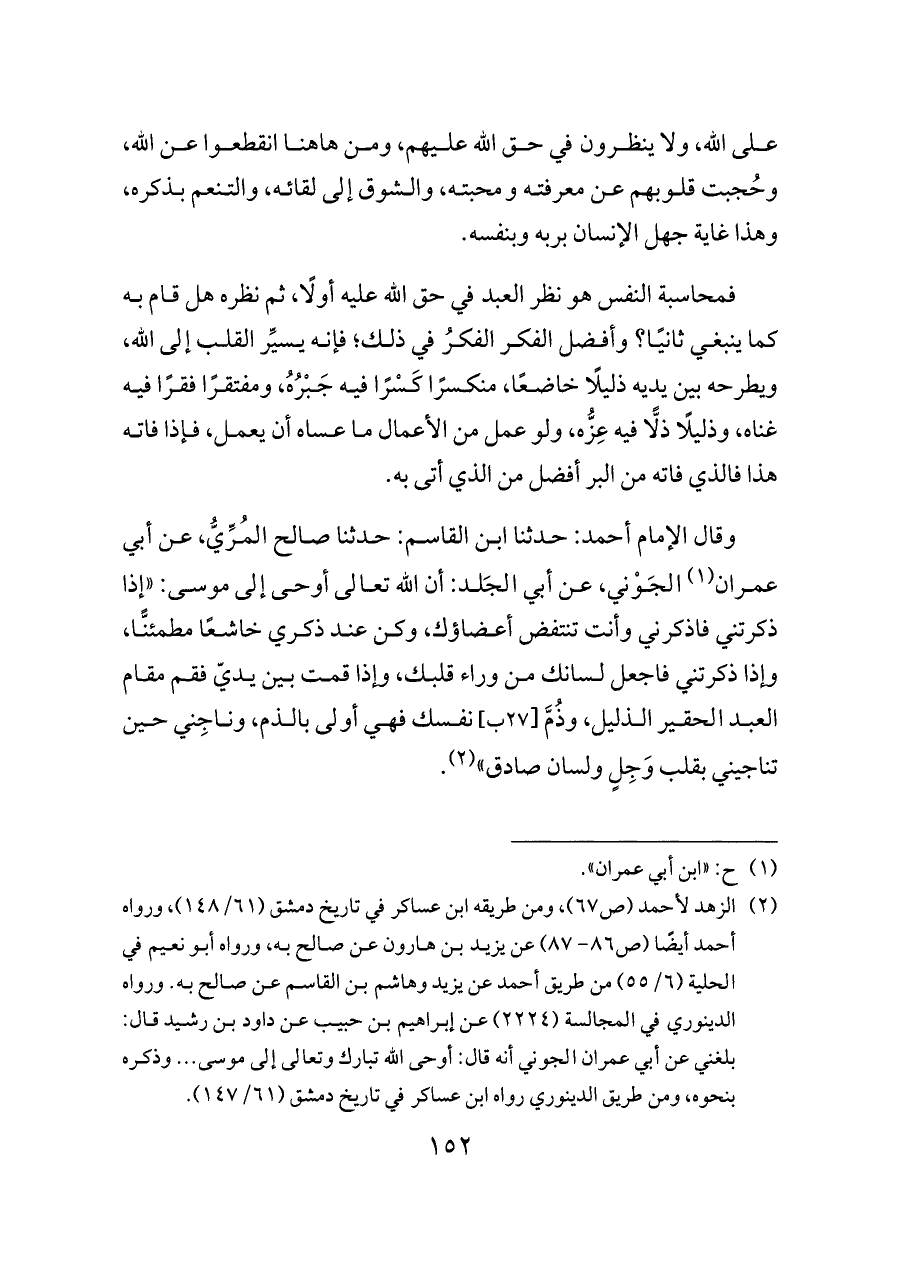 (¬٢) الزهد لأحمد (ص ٦٧)، ومن طريقه ابن عساكر في تاريخ دمشق (٦١/ ١٤٨)، ورواه أحمد أيضًا (ص ٨٦ - ٨٧) عن يزيد بن هارون عن صالح به، ورواه أبو نعيم في الحلية (٦/ ٥٥) من طريق أحمد عن يزيد وهاشم بن القاسم عن صالح به. ورواه الدينوري في المجالسة (٢٢٢٤) عن إبراهيم بن حبيب عن داود بن رشيد قال: بلغني عن أبي عمران الجوني أنه قال: أوحى الله تبارك وتعالى إلى موسى ... وذكره بنحوه، ومن طريق الدينوري رواه ابن عساكر في تاريخ دمشق (٦١/ ١٤٧).