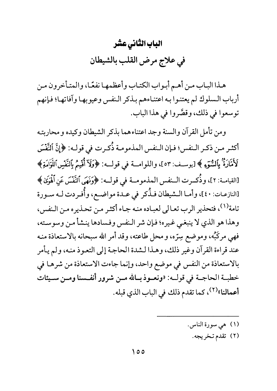 ومن تأمل القرآن والسنة وجد اعتناءهما بذكر الشيطان وكيده ومحاربته أكثر من ذكر النفس؛ فإن النفس المذمومة ذُكرت في قوله: {إِنَّ النَّفْسَ لَأَمَّارَةٌ بِالسُّوءِ} [يوسف: ٥٣]، واللوامة في قوله: {وَلَا أُقْسِمُ بِالنَّفْسِ اللَّوَّامَةِ} [القيامة: ٢]، وذُكرت النفس المذمومة في قوله: {وَنَهَى النَّفْسَ عَنِ الْهَوَى} [النازعات: ٤٠]، وأما الشيطان فذُكر في عدة مواضع، وأُفردت له سورة تامة (¬١)، فتحذير الرب تعالى لعباده منه جاء أكثر من تحذيره من النفس، وهذا هو الذي لا ينبغي غيره؛ فإن شر النفس وفسادها ينشأ من وسوسته، فهي مركَبُه، وموضع سِرّه، ومحل طاعته، وقد أمر الله سبحانه بالاستعاذة منه عند قراءة القرآن وغير ذلك، وهذا لشدة الحاجة إلى التعوذ منه، ولم يأمر بالاستعاذة من النفس في موضع واحد، وإنما جاءت الاستعاذة من شرها في خطبة الحاجة في قوله: «ونعوذ بالله من شرور أنفسنا ومن سيئات أعمالنا» (¬٢)، كما تقدم ذلك في الباب الذي قبله.