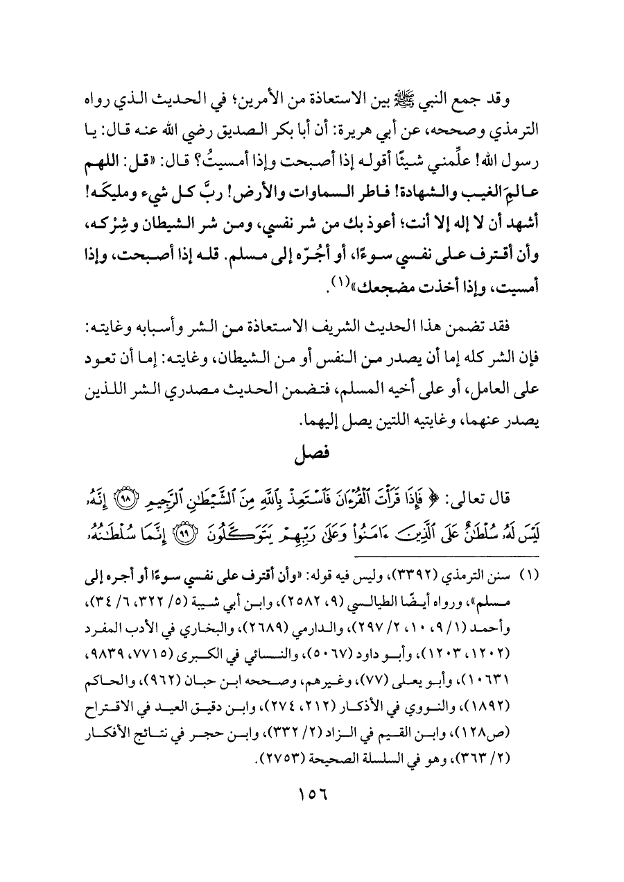 وقد جمع النبي - صلى الله عليه وسلم - بين الاستعاذة من الأمرين؛ في الحديث الذي رواه الترمذي وصححه، عن أبي هريرة: أن أبا بكر الصديق رضي الله عنه قال: يا رسول الله! علِّمني شيئًا أقوله إذا أصبحت وإذا أمسيتُ؟ قال: «قل: اللهم عالِمَ الغيب والشهادة! فاطر السماوات والأرض! ربَّ كل شيء ومليكَه! أشهد أن لا إله إلا أنت؛ أعوذ بك من شر نفسي، ومن شر الشيطان وشِرْكه، وأن أقترف على نفسي سوءًا، أو أجُرّه إلى مسلم. قله إذا أصبحت، وإذا أمسيت، وإذا أخذت مضجعك» (¬١).
