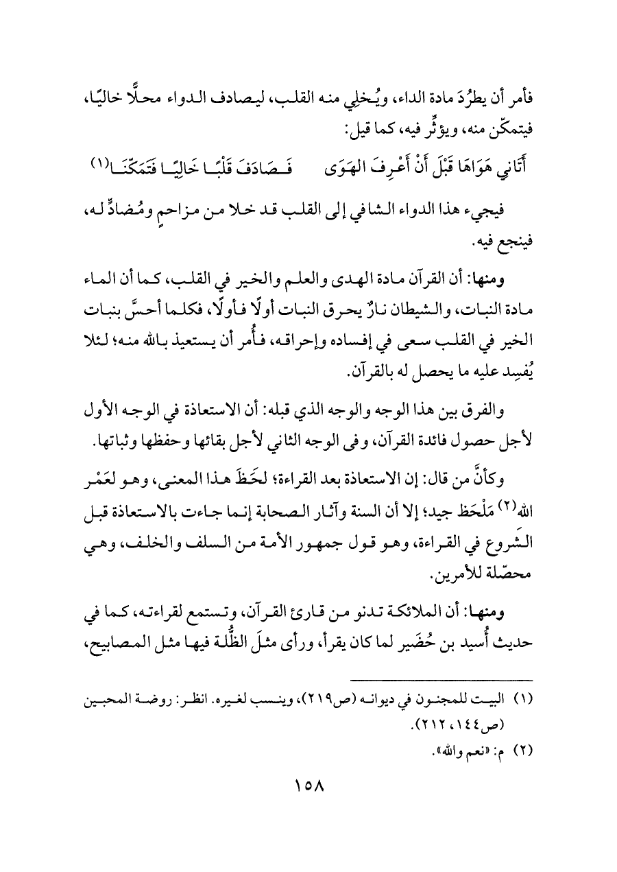 ومنها: أن القرآن مادة الهدى والعلم والخير في القلب، كما أن الماء مادة النبات، والشيطان نارٌ يحرق النبات أولًا فأولًا، فكلما أحسَّ بنبات الخير في القلب سعى في إفساده وإحراقه، فأُمر أن يستعيذ بالله منه؛ لئلا يُفسِد عليه ما يحصل له بالقرآن.