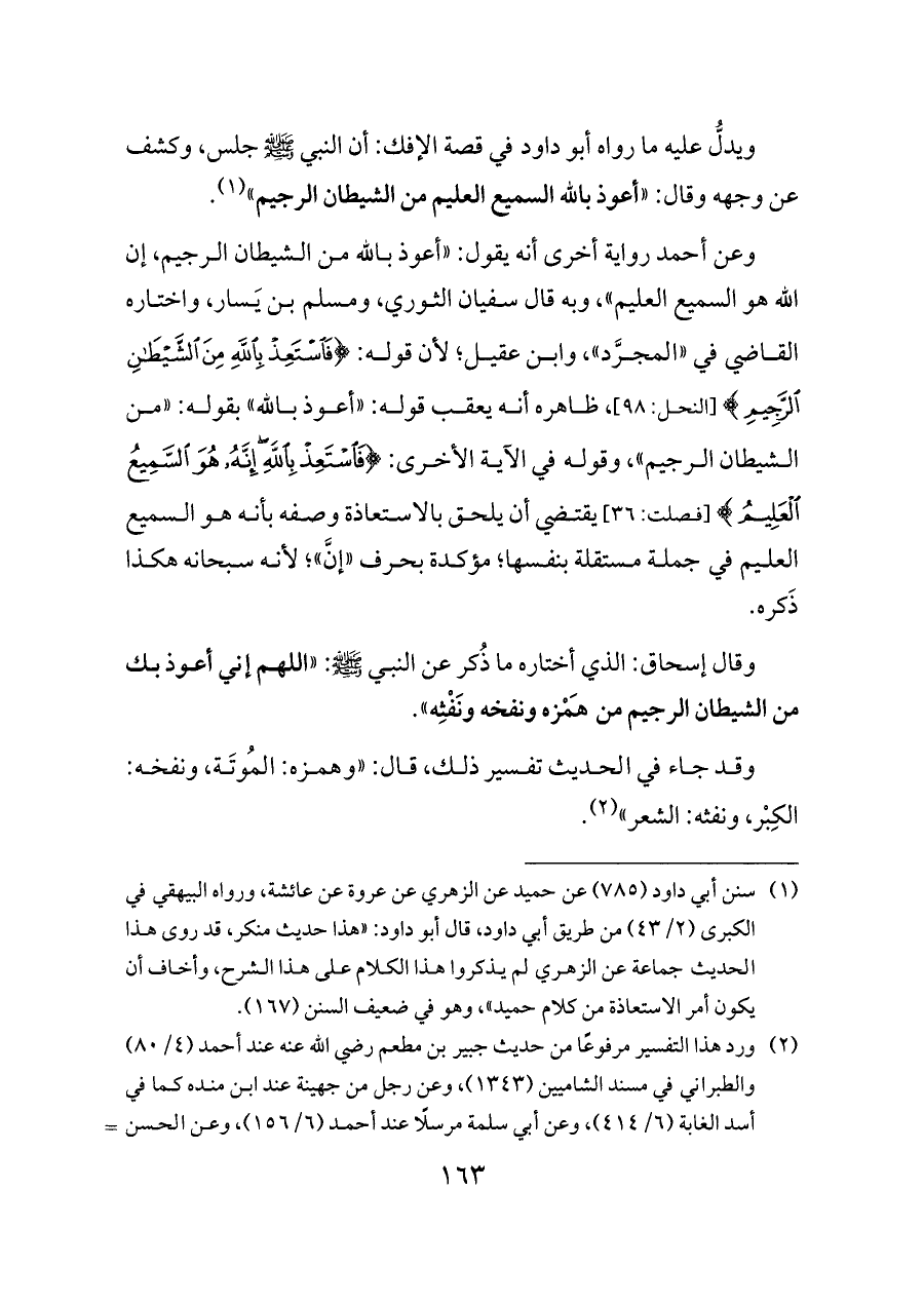وقال إسحاق: الذي أختاره ما ذُكر عن النبي - صلى الله عليه وسلم -: «اللهم إني أعوذ بك من الشيطان الرجيم من هَمْزه ونفخه ونَفْثِه».