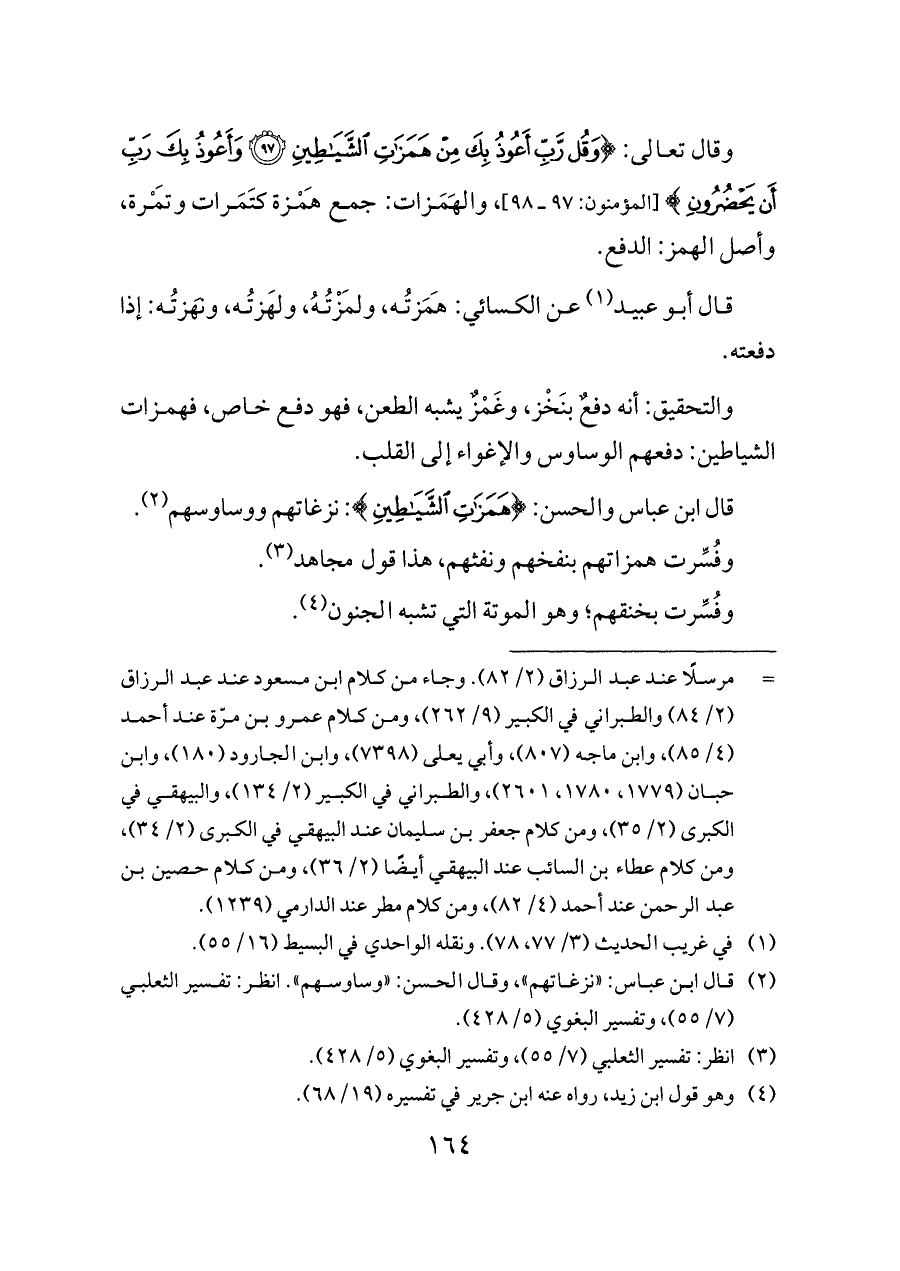 وقال تعالى: {وَقُلْ رَبِّ أَعُوذُ بِكَ مِنْ هَمَزَاتِ الشَّيَاطِينِ (٩٧) وَأَعُوذُ بِكَ رَبِّ أَنْ يَحْضُرُونِ} [المؤمنون: ٩٧ ــ ٩٨]، والهَمَزات: جمع هَمْزة كتَمَرات وتَمْرة، وأصل الهمز: الدفع.