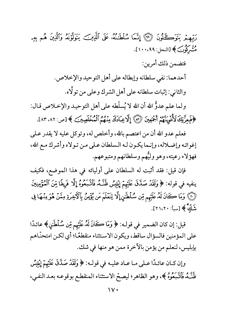 رَبِّهِمْ يَتَوَكَّلُونَ (٩٩) إِنَّمَا سُلْطَانُهُ عَلَى الَّذِينَ يَتَوَلَّوْنَهُ وَالَّذِينَ هُمْ بِهِ مُشْرِكُونَ} [النحل: ٩٩، ١٠٠].