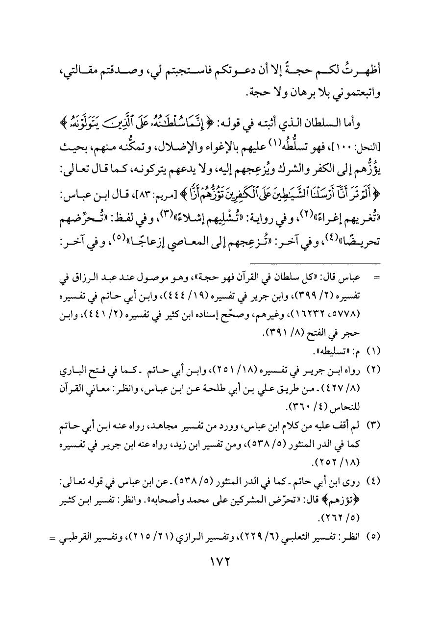 وأما السلطان الذي أثبته في قوله: {إِنَّمَا سُلْطَانُهُ عَلَى الَّذِينَ يَتَوَلَّوْنَهُ} [النحل: ١٠٠]، فهو تسلُّطُه (¬١) عليهم بالإغواء والإضلال، وتمكُّنه منهم، بحيث يؤُزُّهم إلى الكفر والشرك ويُزعِجهم إليه، ولا يدعهم يتركونه، كما قال تعالى: {أَلَمْ تَرَ أَنَّا أَرْسَلْنَا الشَّيَاطِينَ عَلَى الْكَافِرِينَ تَؤُزُّهُمْ أَزًّا} [مريم: ٨٣]، قال ابن عباس: «تُغريهم إغراءً» (¬٢)، وفي رواية: «تُشْلِيهم إشلاءً» (¬٣)، وفي لفظ: «تُحرِّضهم تحريضًا» (¬٤)، وفي آخر: «تُزعِجهم إلى المعاصي إزعاجًا» (¬٥)، وفي آخر:
