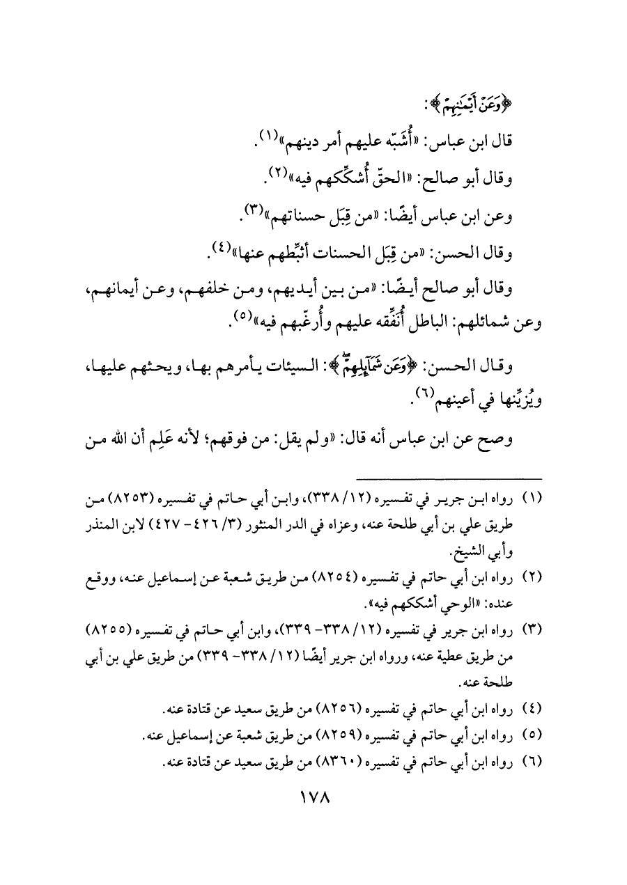 وقال أبو صالح أيضًا: «من بين أيديهم، ومن خلفهم، وعن أيمانهم، وعن شمائلهم: الباطل أُنَفِّقه عليهم وأُرغّبهم فيه» (¬٥).