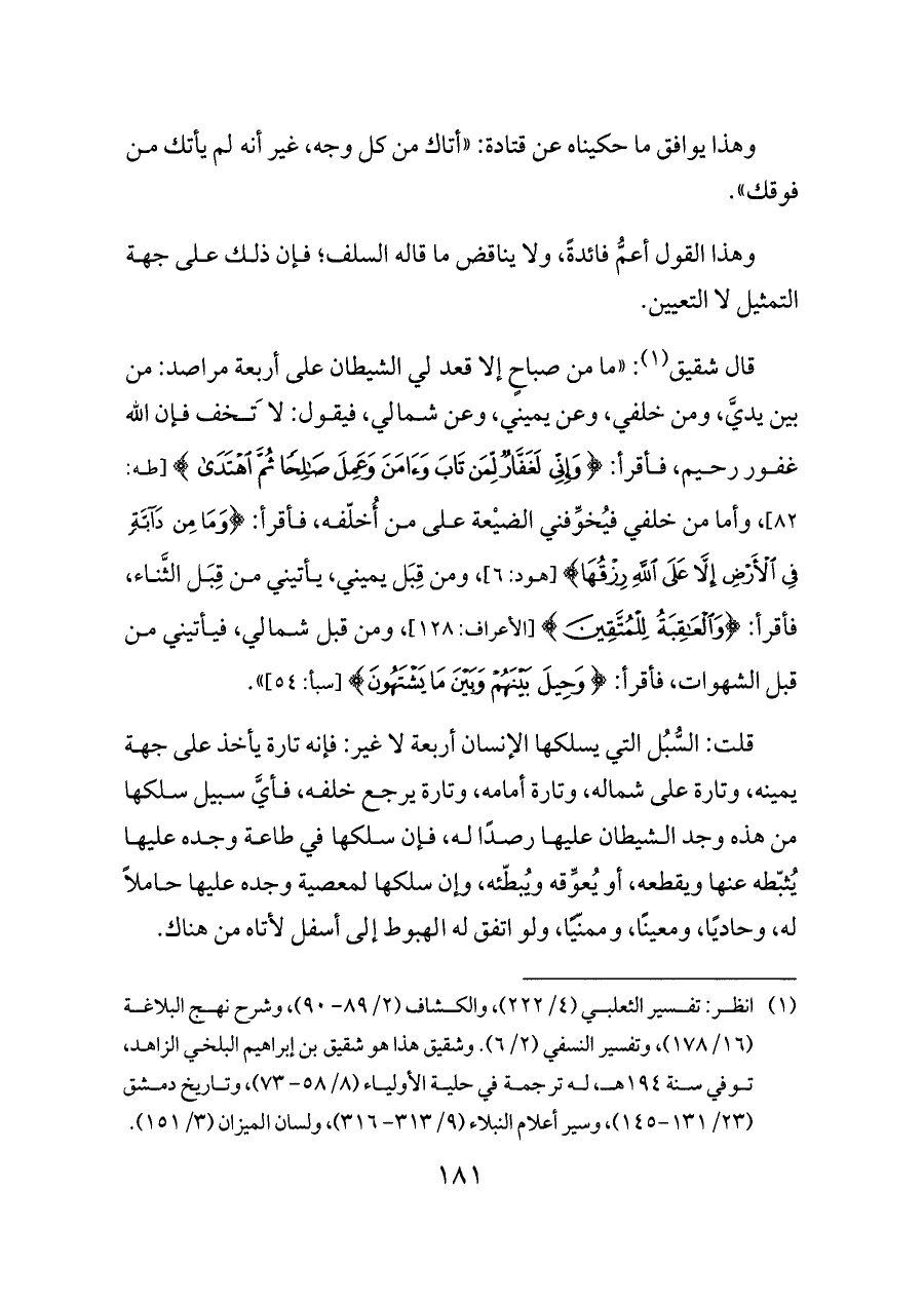 قال شقيق (¬١): «ما من صباحٍ إلا قعد لي الشيطان على أربعة مراصد: من بين يديَّ، ومن خلفي، وعن يميني، وعن شمالي، فيقول: لا تَخف فإن الله غفور رحيم، فأقرأ: {وَإِنِّي لَغَفَّارٌ لِمَنْ تَابَ وَآمَنَ وَعَمِلَ صَالِحًا ثُمَّ اهْتَدَى} [طه: ٨٢]، وأما من خلفي فيُخوِّفني الضيْعة على من أُخلّفه، فأقرأ: {وَمَا مِنْ دَابَّةٍ فِي الْأَرْضِ إِلَّا عَلَى اللَّهِ رِزْقُهَا} [هود: ٦]، ومن قِبَل يميني، يأتيني من قِبَل الثَّناء، فأقرأ: {وَالْعَاقِبَةُ لِلْمُتَّقِينَ} [الأعراف: ١٢٨]، ومن قبل شمالي، فيأتيني من قبل الشهوات، فأقرأ: {وَحِيلَ بَيْنَهُمْ وَبَيْنَ مَا يَشْتَهُونَ} [سبأ: ٥٤]».