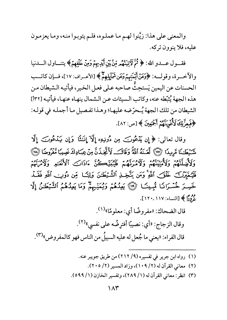 وقال تعالى: {إِنْ يَدْعُونَ مِنْ دُونِهِ إِلَّا إِنَاثًا وَإِنْ يَدْعُونَ إِلَّا شَيْطَانًا مَرِيدًا (١١٧) لَعَنَهُ اللَّهُ وَقَالَ لَأَتَّخِذَنَّ مِنْ عِبَادِكَ نَصِيبًا مَفْرُوضًا (١١٨) وَلَأُضِلَّنَّهُمْ وَلَأُمَنِّيَنَّهُمْ وَلَآمُرَنَّهُمْ فَلَيُبَتِّكُنَّ آذَانَ الْأَنْعَامِ وَلَآمُرَنَّهُمْ فَلَيُغَيِّرُنَّ خَلْقَ اللَّهِ وَمَنْ يَتَّخِذِ الشَّيْطَانَ وَلِيًّا مِنْ دُونِ اللَّهِ فَقَدْ خَسِرَ خُسْرَانًا مُبِينًا (١١٩) يَعِدُهُمْ وَيُمَنِّيهِمْ وَمَا يَعِدُهُمُ الشَّيْطَانُ إِلَّا غُرُورًا} [النساء: ١١٧ ـ ١٢٠].