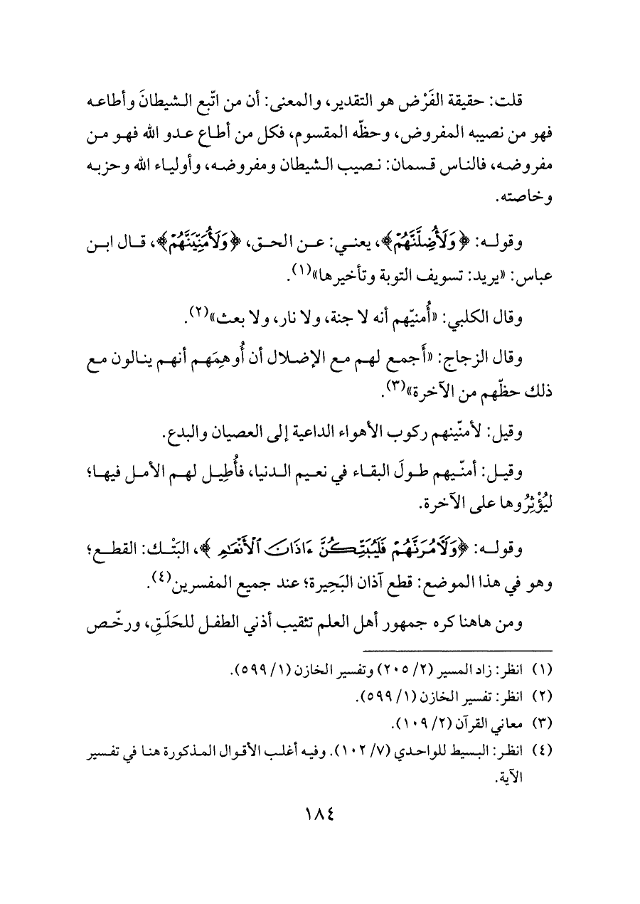 وقوله: {وَلَأُضِلَّنَّهُمْ}، يعني: عن الحق، {وَلَأُمَنِّيَنَّهُمْ}، قال ابن عباس: «يريد: تسويف التوبة وتأخيرها» (¬١).