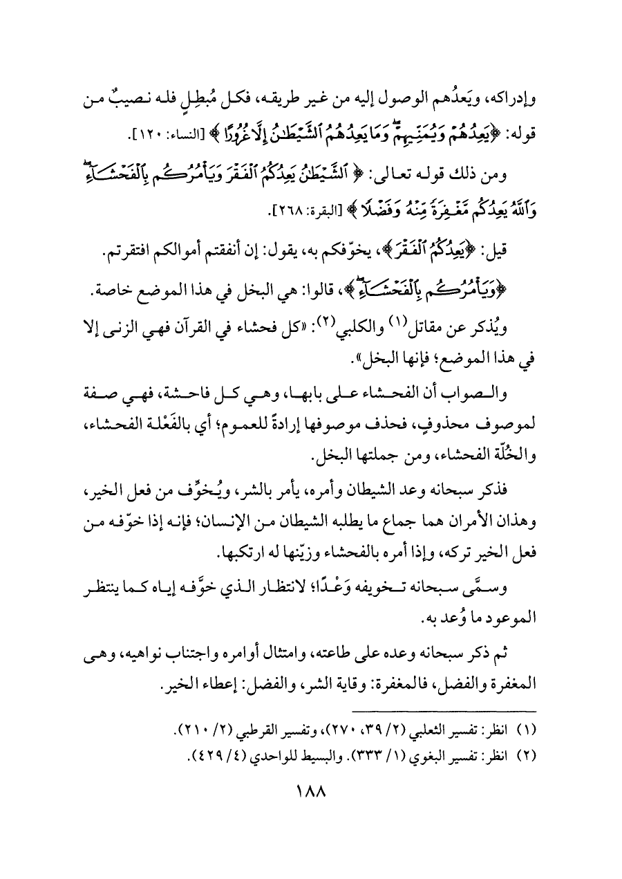 ومن ذلك قوله تعالى: {الشَّيْطَانُ يَعِدُكُمُ الْفَقْرَ وَيَأْمُرُكُمْ بِالْفَحْشَاءِ وَاللَّهُ يَعِدُكُمْ مَغْفِرَةً مِنْهُ وَفَضْلًا} [البقرة: ٢٦٨].
