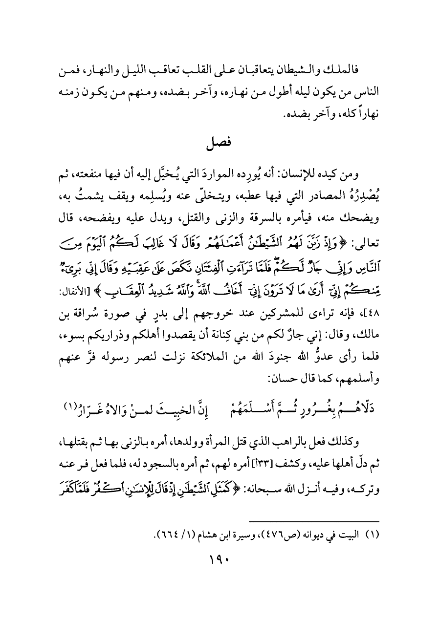 ومن كيده للإنسان: أنه يُورِده المواردَ التي يُخيَّل إليه أن فيها منفعته، ثم يُصْدِرُهُ المصادر التي فيها عطبه، ويتخلّى عنه ويُسلِمه ويقف يشمتُ به، ويضحك منه، فيأمره بالسرقة والزنى والقتل، ويدل عليه ويفضحه، قال تعالى: {وَإِذْ زَيَّنَ لَهُمُ الشَّيْطَانُ أَعْمَالَهُمْ وَقَالَ لَا غَالِبَ لَكُمُ الْيَوْمَ مِنَ النَّاسِ وَإِنِّي جَارٌ لَكُمْ فَلَمَّا تَرَاءَتِ الْفِئَتَانِ نَكَصَ عَلَى عَقِبَيْهِ وَقَالَ إِنِّي بَرِيءٌ مِنْكُمْ إِنِّي أَرَى مَا لَا تَرَوْنَ إِنِّي أَخَافُ اللَّهَ وَاللَّهُ شَدِيدُ الْعِقَابِ} [الأنفال: ٤٨]، فإنه تراءى للمشركين عند خروجهم إلى بدرٍ في صورة سُراقة بن مالك، وقال: إني جارٌ لكم من بني كِنانة أن يقصدوا أهلكم وذراريكم بسوء، فلما رأى عدوُّ الله جنودَ الله من الملائكة نزلت لنصر رسوله فرَّ عنهم وأسلمهم، كما قال حسان: