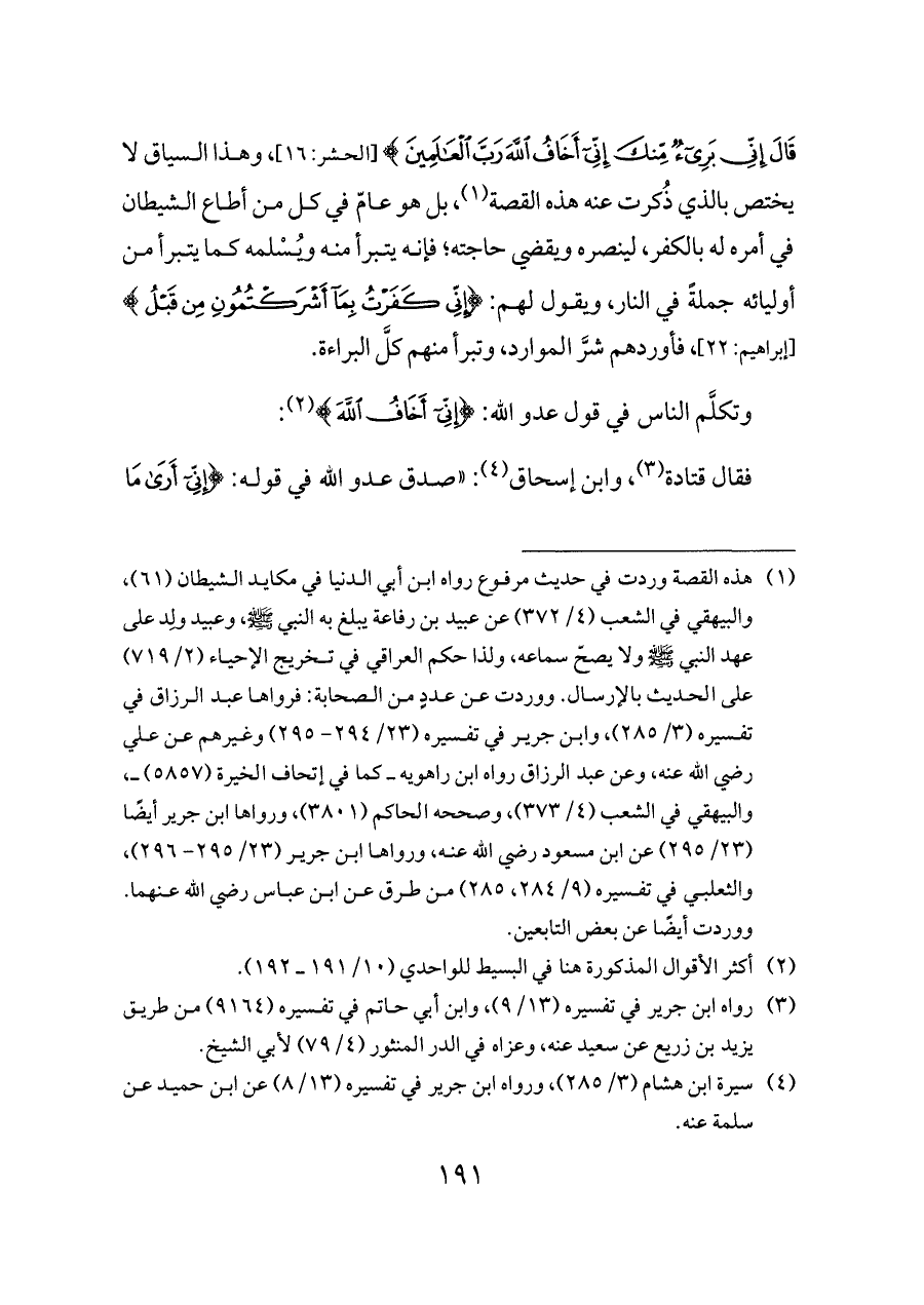 (¬١) هذه القصة وردت في حديث مرفوع رواه ابن أبي الدنيا في مكايد الشيطان (٦١)، والبيهقي في الشعب (٤/ ٣٧٢) عن عبيد بن رفاعة يبلغ به النبي - صلى الله عليه وسلم -، وعبيد ولِد على عهد النبي - صلى الله عليه وسلم - ولا يصحّ سماعه، ولذا حكم العراقي في تخريج الإحياء (٢/ ٧١٩) على الحديث بالإرسال. ووردت عن عددٍ من الصحابة: فرواها عبد الرزاق في تفسيره (٣/ ٢٨٥)، وابن جرير في تفسيره (٢٣/ ٢٩٤ - ٢٩٥) وغيرهم عن علي رضي الله عنه، وعن عبد الرزاق رواه ابن راهويه ــ كما في إتحاف الخيرة (٥٨٥٧) ــ، والبيهقي في الشعب (٤/ ٣٧٣)، وصححه الحاكم (٣٨٠١)، ورواها ابن جرير أيضًا (٢٣/ ٢٩٥) عن ابن مسعود رضي الله عنه، ورواها ابن جرير (٢٣/ ٢٩٥ - ٢٩٦)، والثعلبي في تفسيره (٩/ ٢٨٤، ٢٨٥) من طرق عن ابن عباس رضي الله عنهما. ووردت أيضًا عن بعض التابعين.