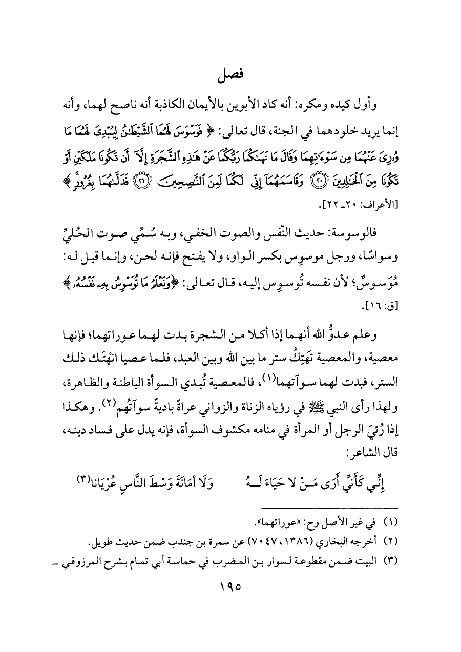 وعلم عدوُّ الله أنهما إذا أكلا من الشجرة بدت لهما عوراتهما؛ فإنها معصية، والمعصية تَهتِكُ ستر ما بين الله وبين العبد، فلما عصيا انْهتَك ذلك الستر، فبدت لهما سوآتهما (¬١)، فالمعصية تُبدي السوأة الباطنة والظاهرة، ولهذا رأى النبي - صلى الله عليه وسلم - في رؤياه الزناة والزواني عراةً باديةً سوآتُهم (¬٢). وهكذا إذا رُئيَ الرجل أو المرأة في منامه مكشوف السوأة، فإنه يدل على فساد دينه، قال الشاعر: