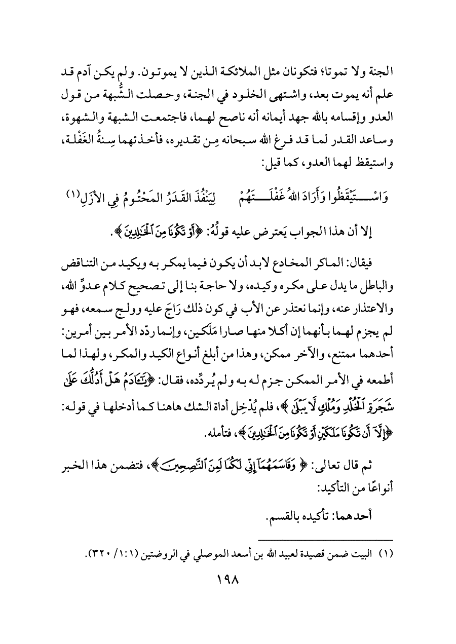 الجنة ولا تموتا؛ فتكونان مثل الملائكة الذين لا يموتون. ولم يكن آدم قد علم أنه يموت بعد، واشتهى الخلود في الجنة، وحصلت الشُّبهة من قول العدو وإقسامه بالله جهد أيمانه أنه ناصح لهما، فاجتمعت الشبهة والشهوة، وساعد القدر لما قد فرغ الله سبحانه مِن تقديره، فأخذتهما سِنةُ الغَفْلة، واستيقظ لهما العدو، كما قيل: