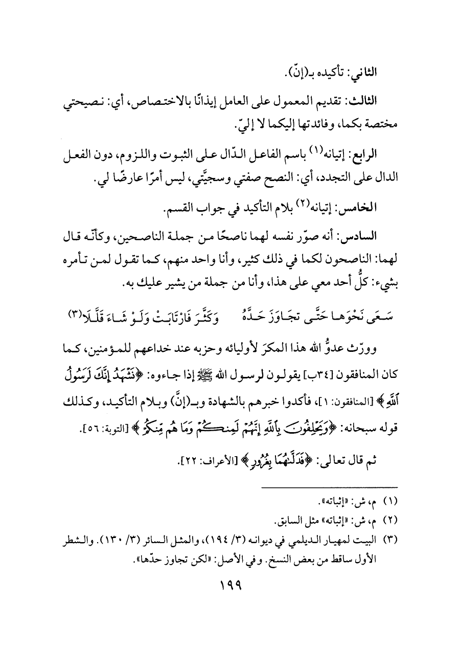 وورّث عدوُّ الله هذا المكرَ لأوليائه وحزبه عند خداعهم للمؤمنين، كما كان المنافقون [٣٤ ب] يقولون لرسول الله - صلى الله عليه وسلم - إذا جاءوه: {نَشْهَدُ إِنَّكَ لَرَسُولُ اللَّهِ} [المنافقون: ١]، فأكدوا خبرهم بالشهادة وبـ (إنَّ) وبلام التأكيد، وكذلك قوله سبحانه: {وَيَحْلِفُونَ بِاللَّهِ إِنَّهُمْ لَمِنْكُمْ وَمَا هُمْ مِنْكُمْ} [التوبة: ٥٦].
