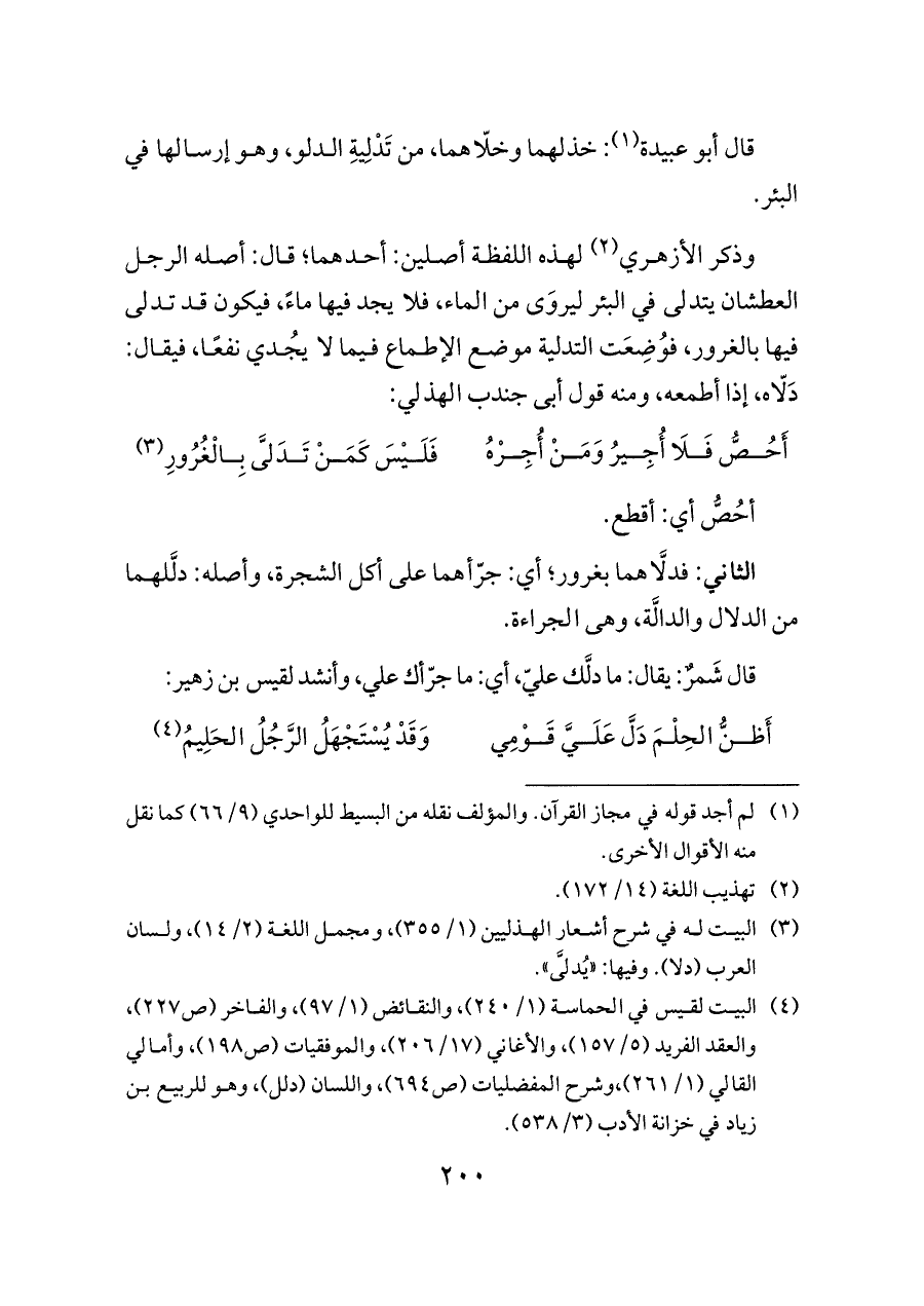 وذكر الأزهري (¬٢) لهذه اللفظة أصلين: أحدهما؛ قال: أصله الرجل العطشان يتدلى في البئر ليروَى من الماء، فلا يجد فيها ماءً، فيكون قد تدلى فيها بالغرور، فوُضِعَت التدلية موضع الإطماع فيما لا يُجدي نفعًا، فيقال: دَلّاه، إذا أطمعه، ومنه قول أبى جندب الهذلي:
