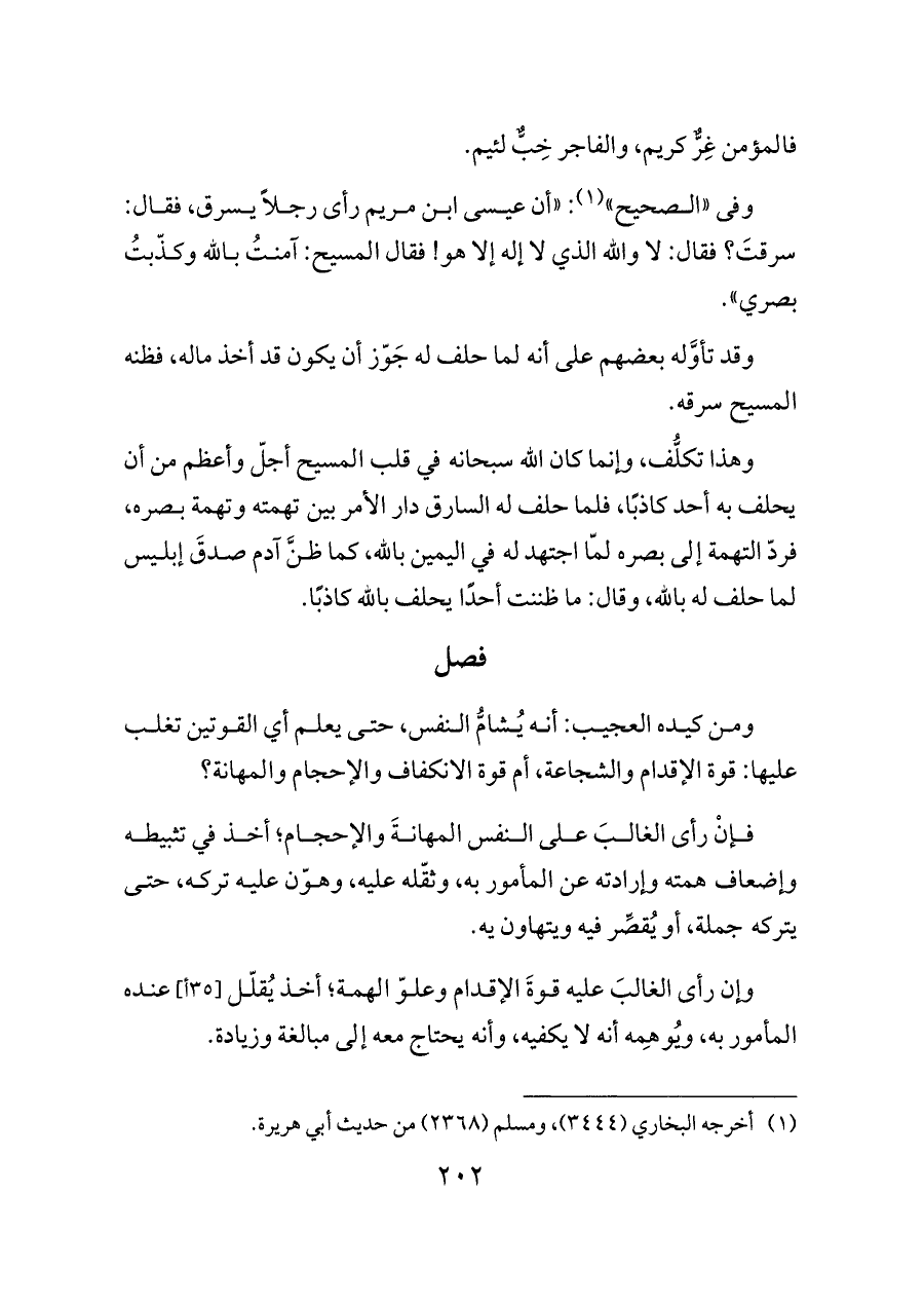 ومن كيده العجيب: أنه يُشامُّ النفس، حتى يعلم أي القوتين تغلب عليها: قوة الإقدام والشجاعة، أم قوة الانكفاف والإحجام والمهانة؟