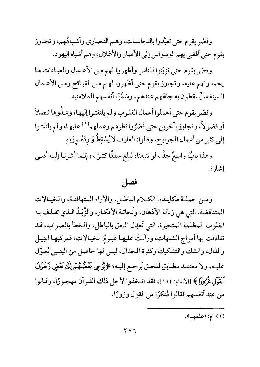 وقصّر بقوم حتى أهملوا أعمال القلوب ولم يلتفتوا إليها، وعدُّوها فضلاً أو فضولاً، وتجاوز بآخرين حتى قَصَرُوا نظرهم وعملهم (¬١) عليها، ولم يلتفتوا إلى كثير من أعمال الجوارح، وقالوا: العارف لا يُسْقِطُ وَارِدَهُ لوِرْدِهِ.