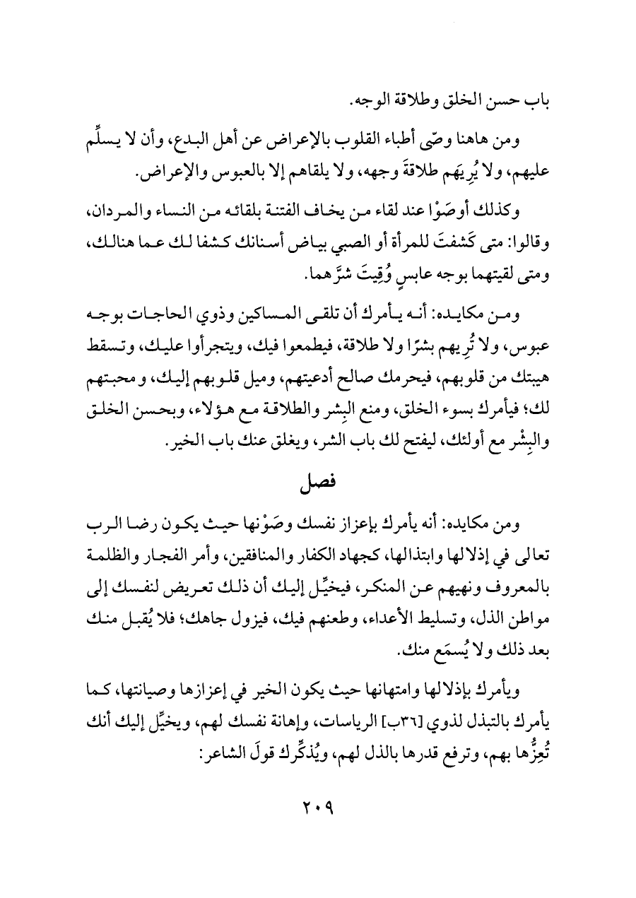 ومن مكايده: أنه يأمرك أن تلقى المساكين وذوي الحاجات بوجه عبوس، ولا تُرِيهم بشرًا ولا طلاقة، فيطمعوا فيك، ويتجرأوا عليك، وتسقط هيبتك من قلوبهم، فيحرمك صالح أدعيتهم، وميل قلوبهم إليك، ومحبتهم لك؛ فيأمرك بسوء الخلق، ومنع البِشر والطلاقة مع هؤلاء، وبحسن الخلق والبِشْر مع أولئك، ليفتح لك باب الشر، ويغلق عنك باب الخير.