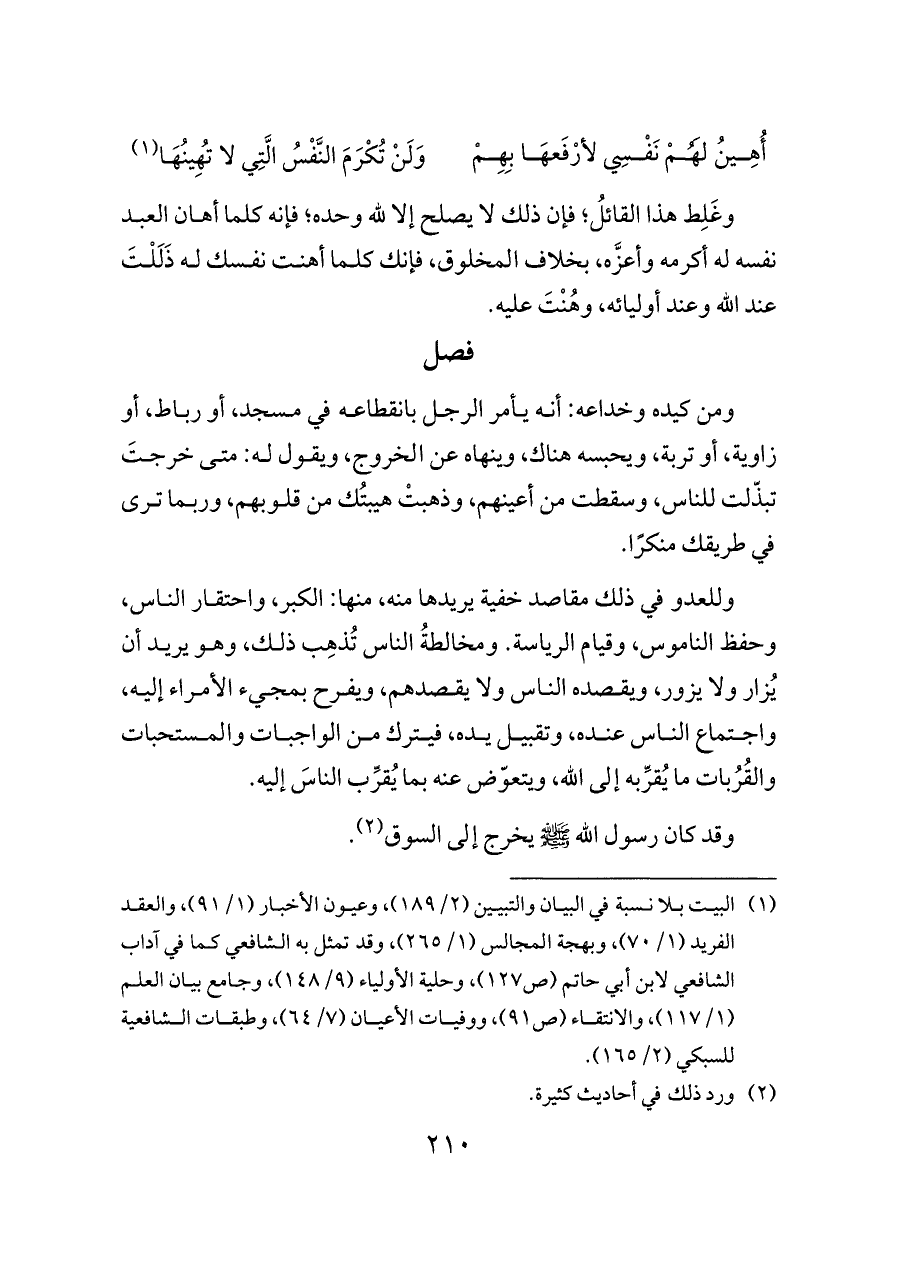 وللعدو في ذلك مقاصد خفية يريدها منه، منها: الكبر، واحتقار الناس، وحفظ الناموس، وقيام الرياسة. ومخالطةُ الناس تُذهِب ذلك، وهو يريد أن يُزار ولا يزور، ويقصده الناس ولا يقصدهم، ويفرح بمجيء الأمراء إليه، واجتماع الناس عنده، وتقبيل يده، فيترك من الواجبات والمستحبات والقُرُبات ما يُقرِّبه إلى الله، ويتعوّض عنه بما يُقرِّب الناسَ إليه.